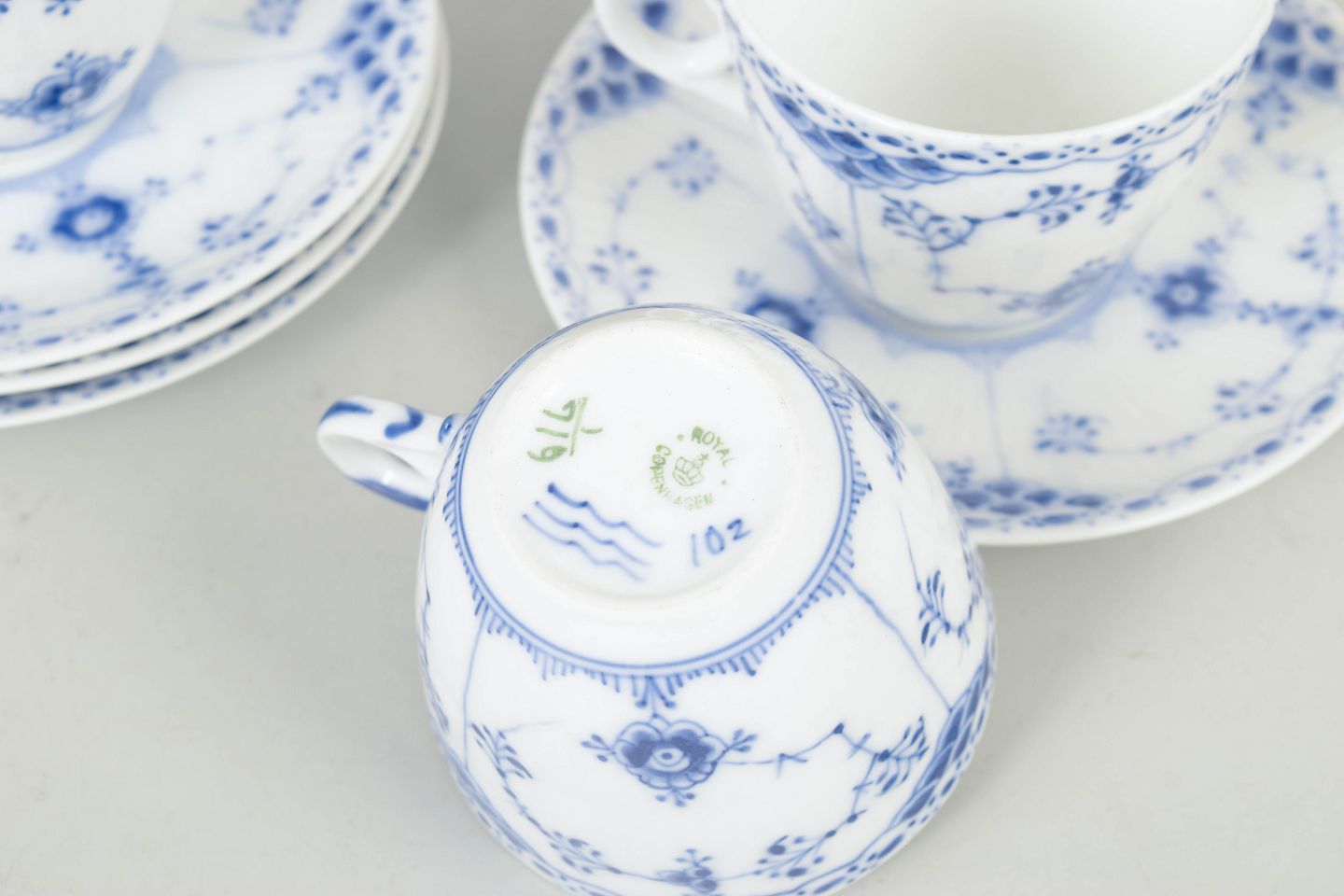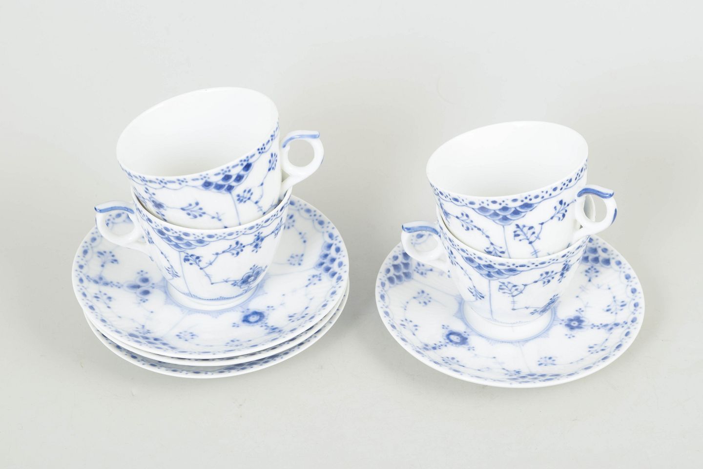Royal Copenhagen Blue Fluted Half Lace, set of four coffee cups with matching saucers.