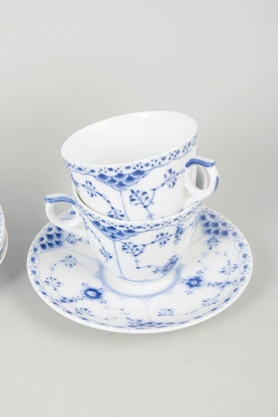 Hand-painted coffee cups with matching saucers in porcelain with the Blue Fluted Half Lace decoration, model 1/719, first factory quality.