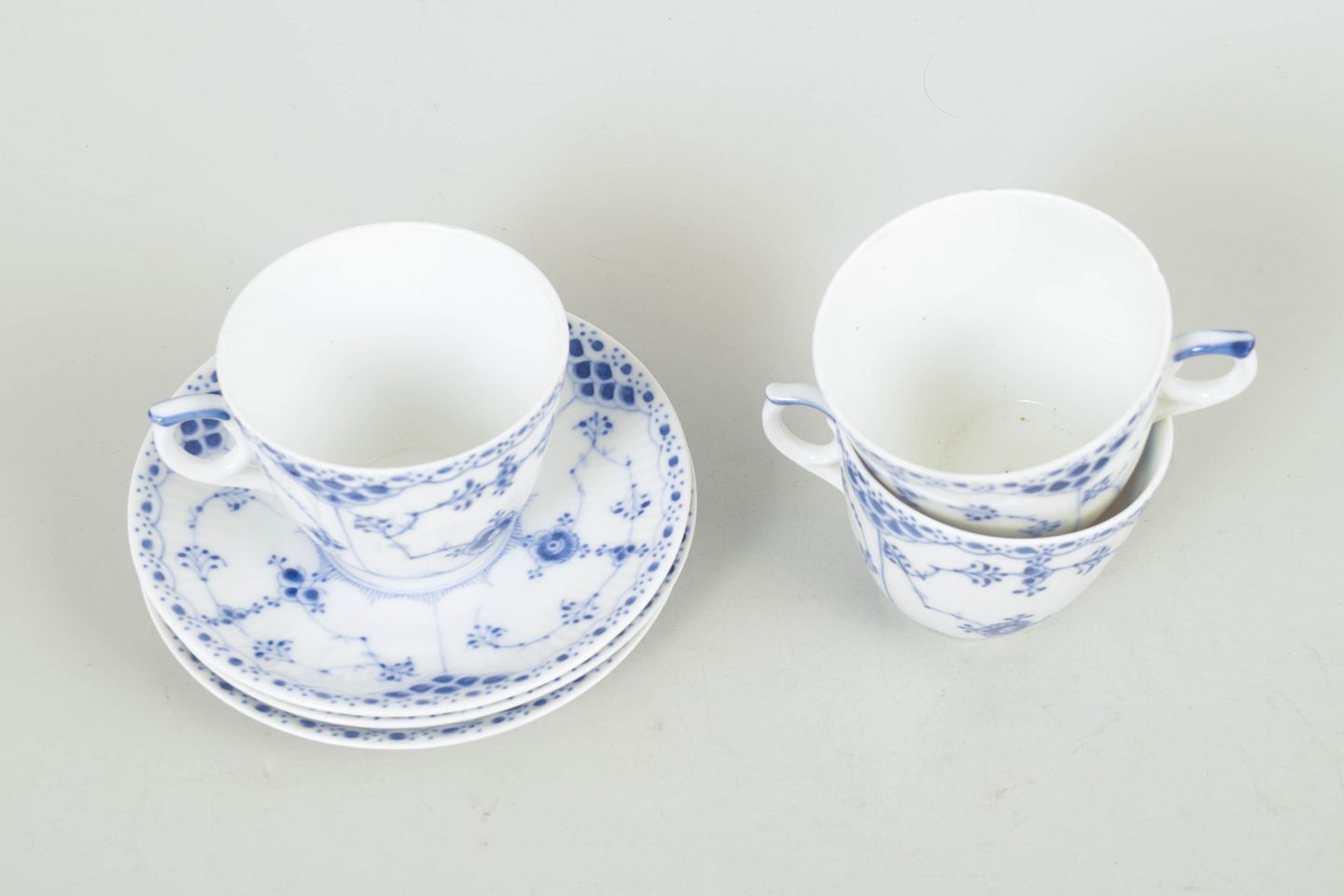 Royal Copenhagen Blue Fluted Half Lace, set of three coffee cups with saucers.