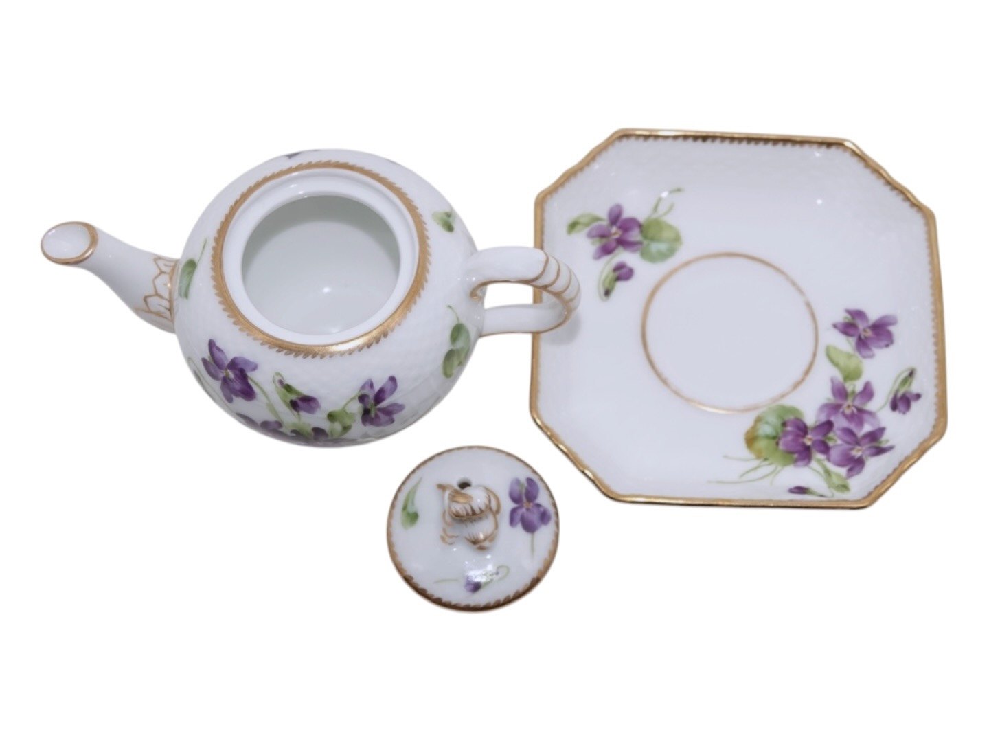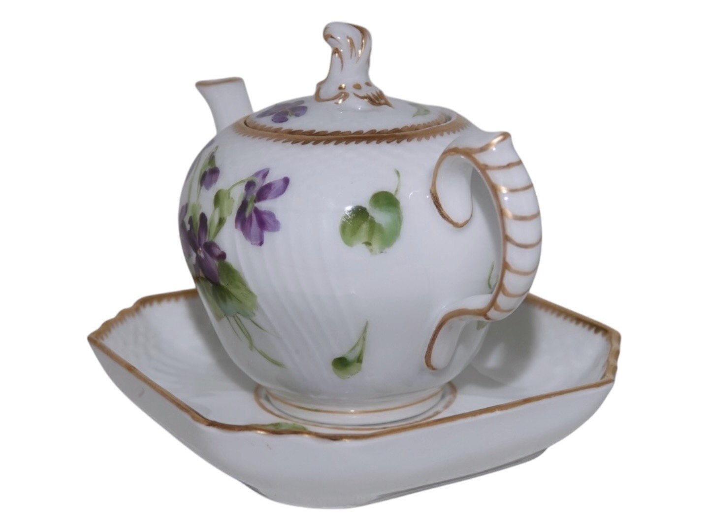 Royal Copenhagen Blue Viols with gold edge, miniature teapot with platter.