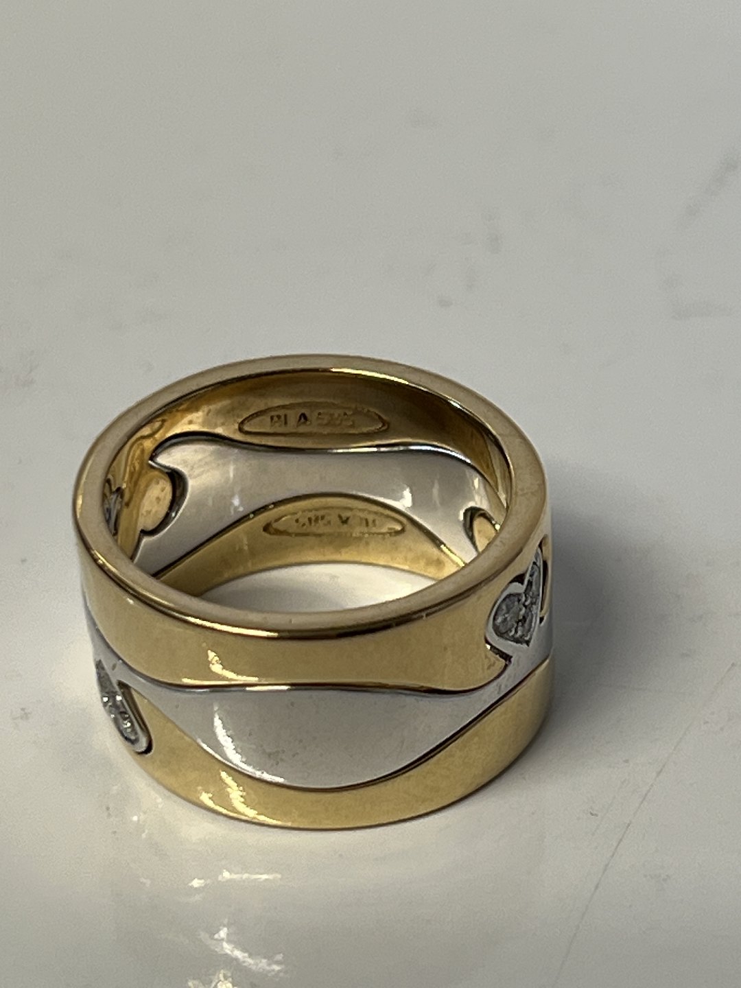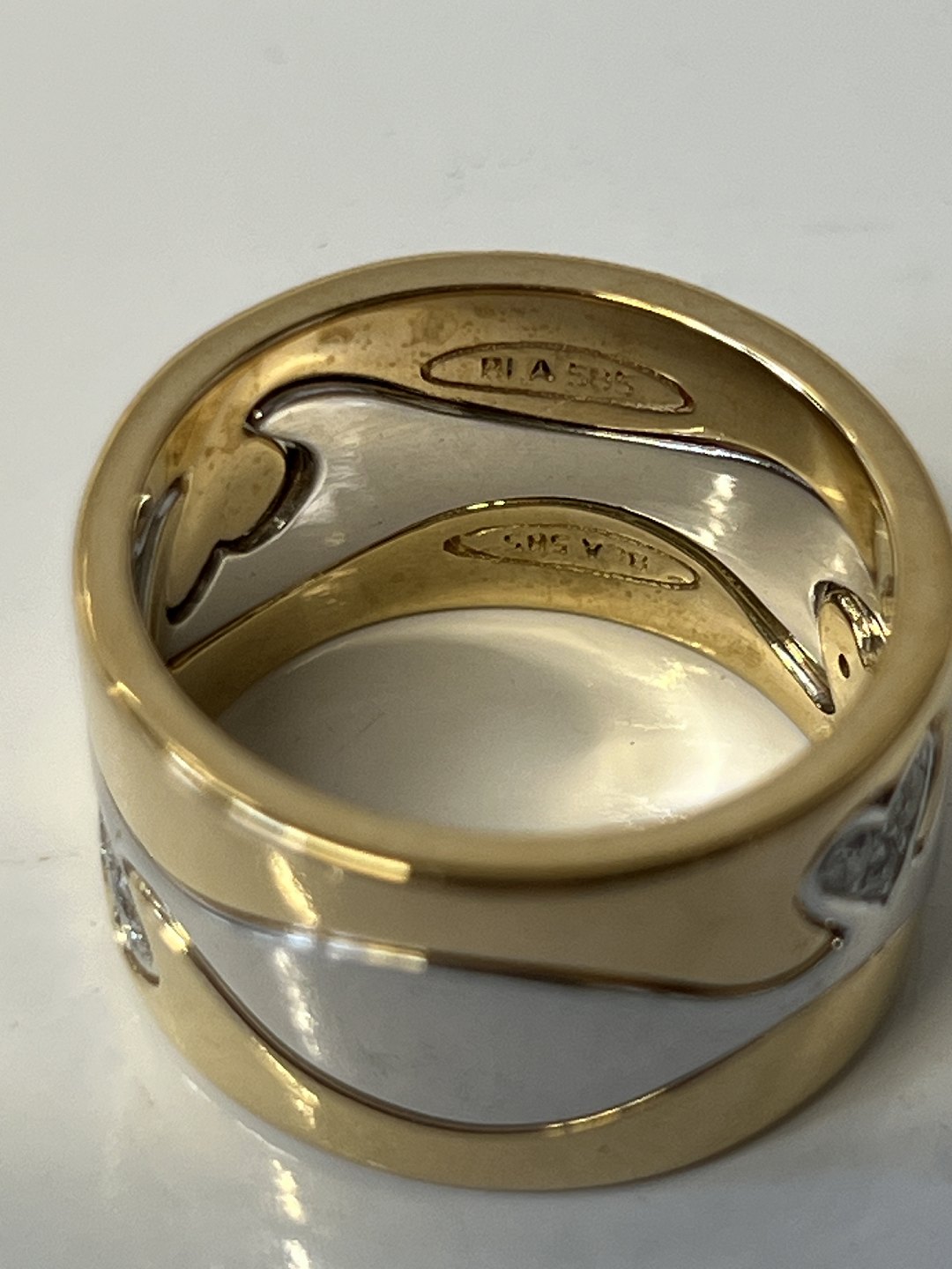 14 carat ladies' ring, with inlaid diamonds, in red and white gold.