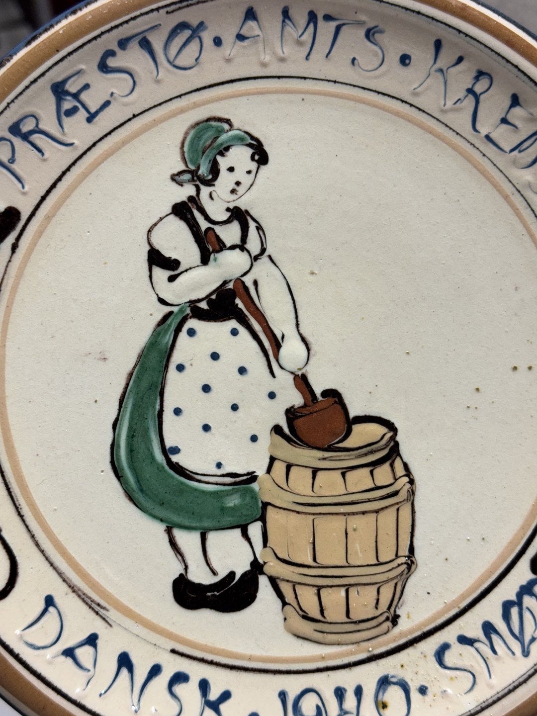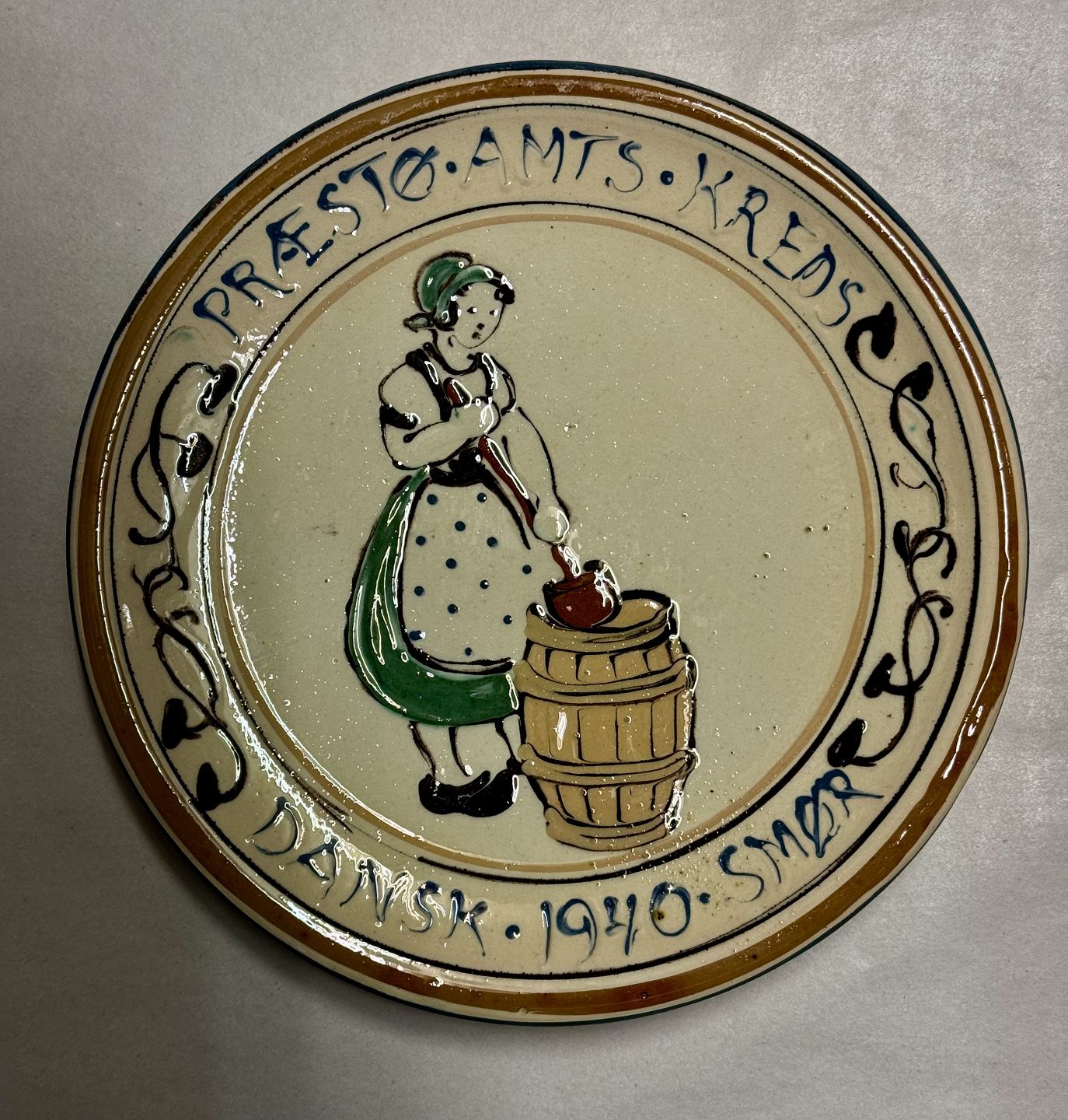 Præstø, Butter plate from the Kähler factory with a painted motif with the milkmaid. The plate's text: "Præstø Amts Kreds Dansk 1940 Butter. Appears in good condition. Kähler factory logo on the back. Ø. 20.7 cm