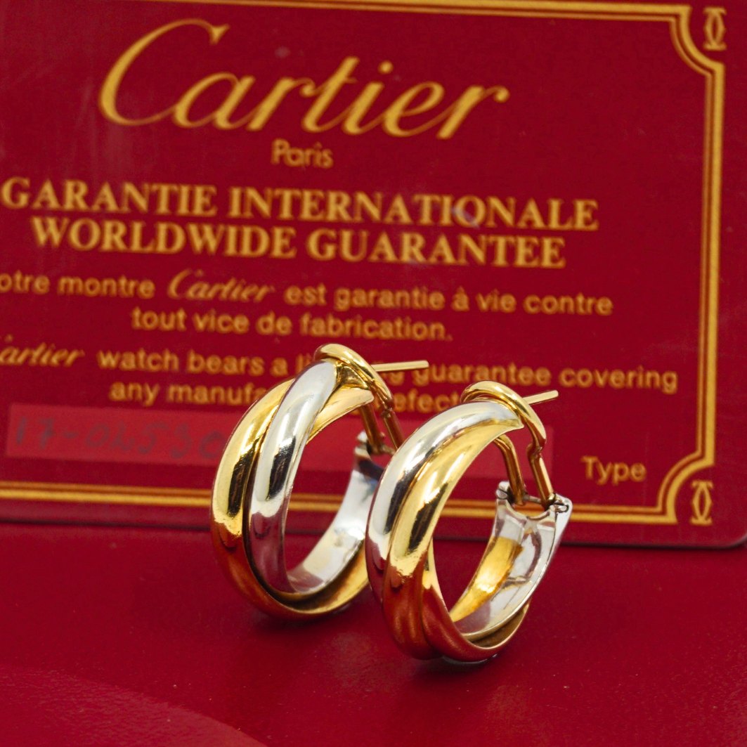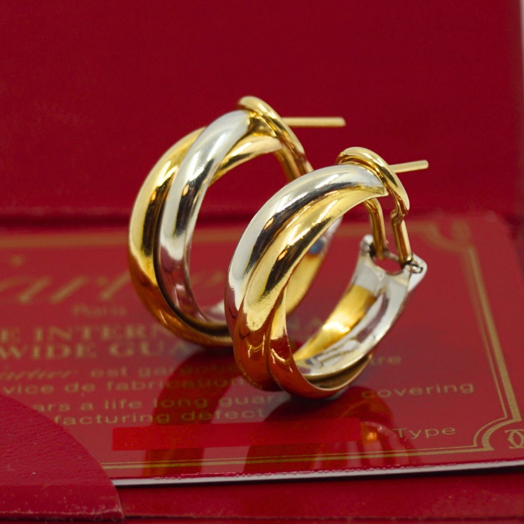 Pair of Cartier Trinity earrings in medium size made of 18k gold, rose gold, and white gold.
