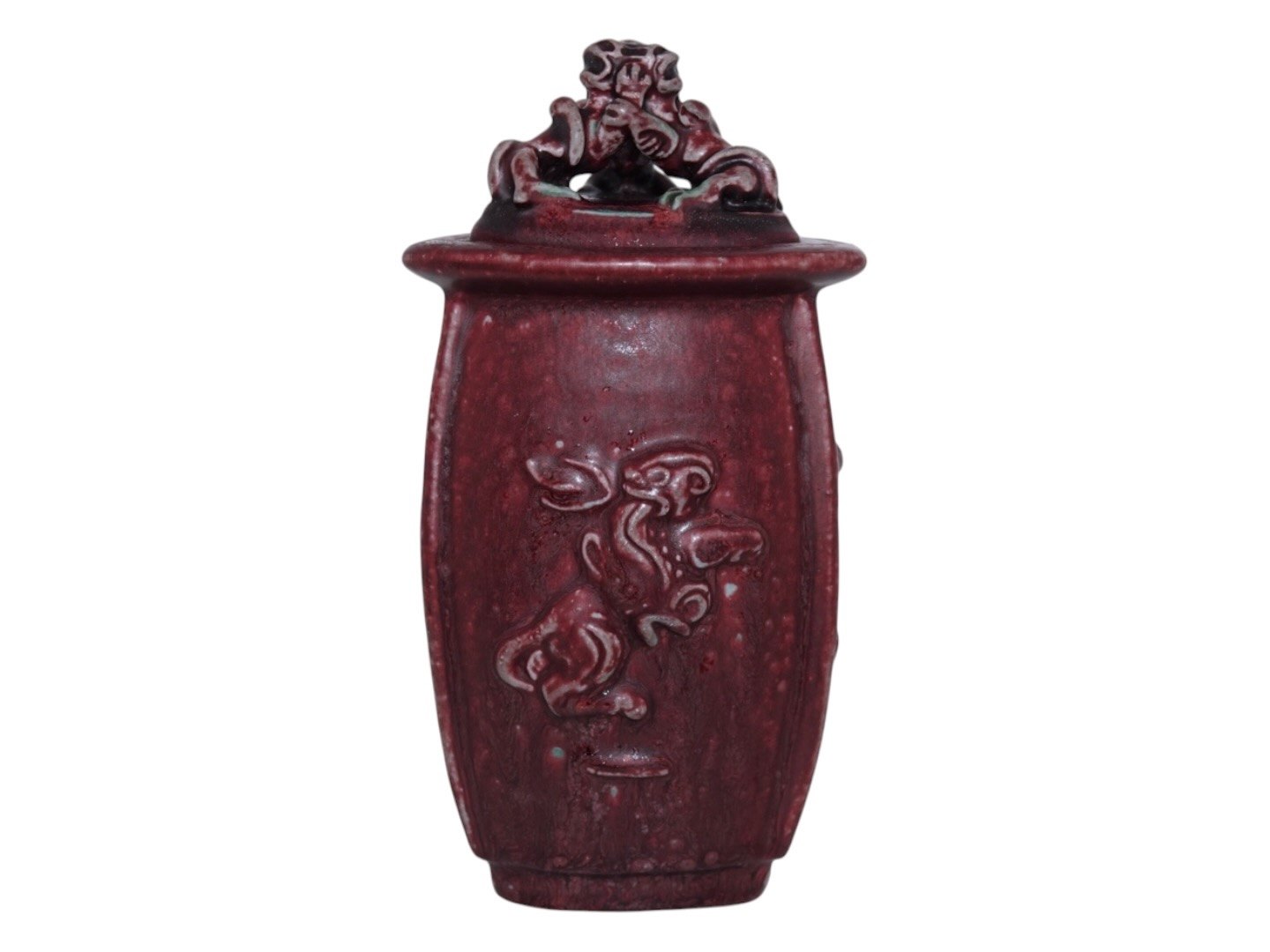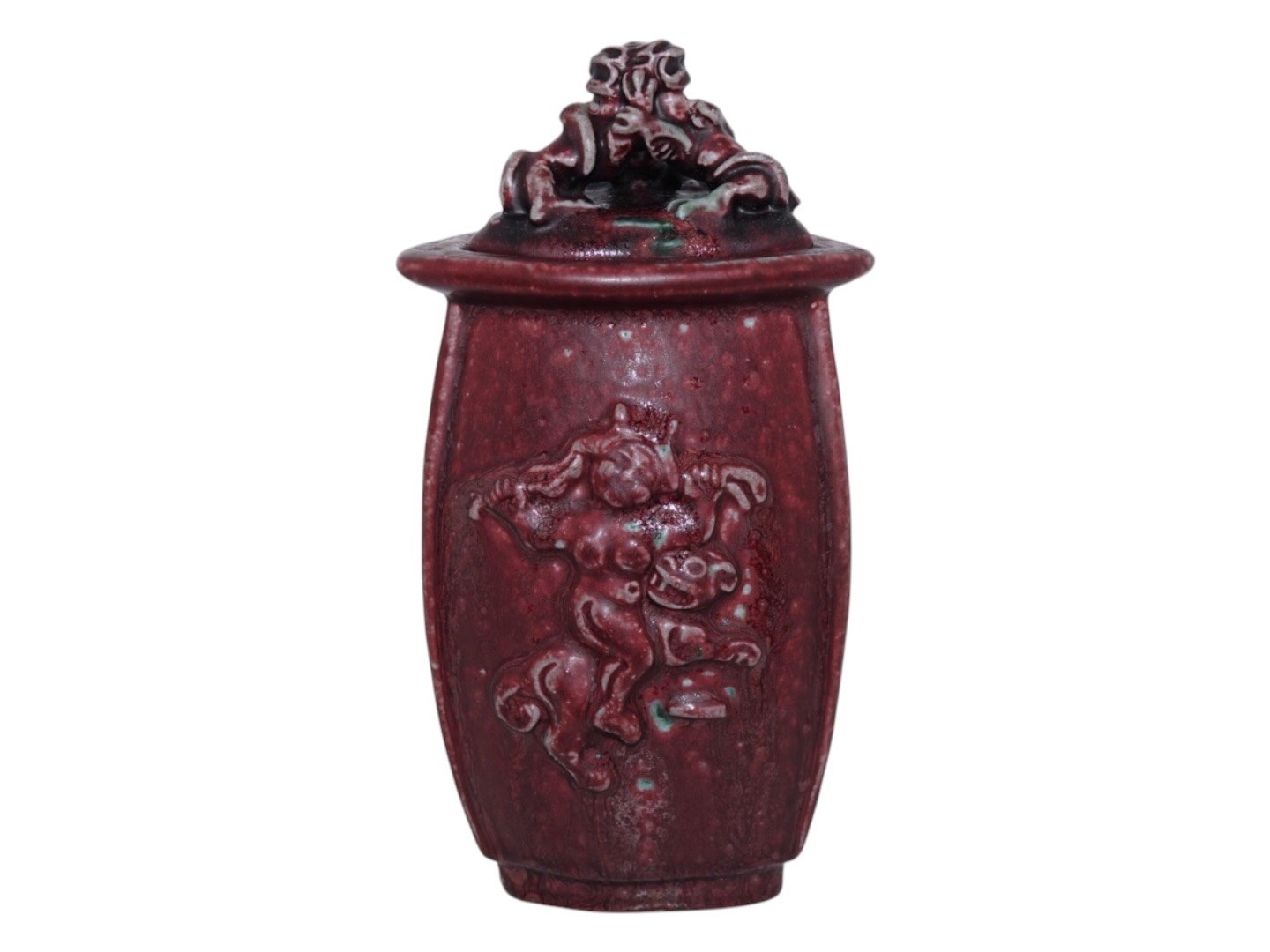 Royal Copenhagen art pottery with red ox blood glaze, triangular lidded vase designed and signed by artist Bode Willumsen.