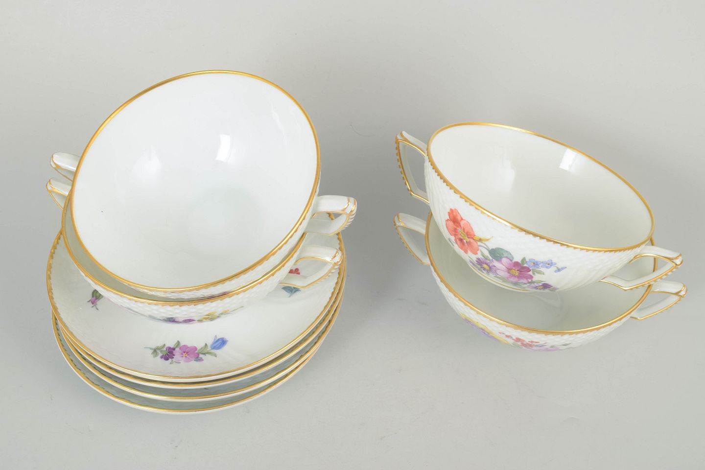 Set of four bouillon cups with matching saucers in porcelain decorated with hand-painted floral motifs in the Saxon flower pattern and finished with a gilded rim. Model 4/1872. First factory quality.