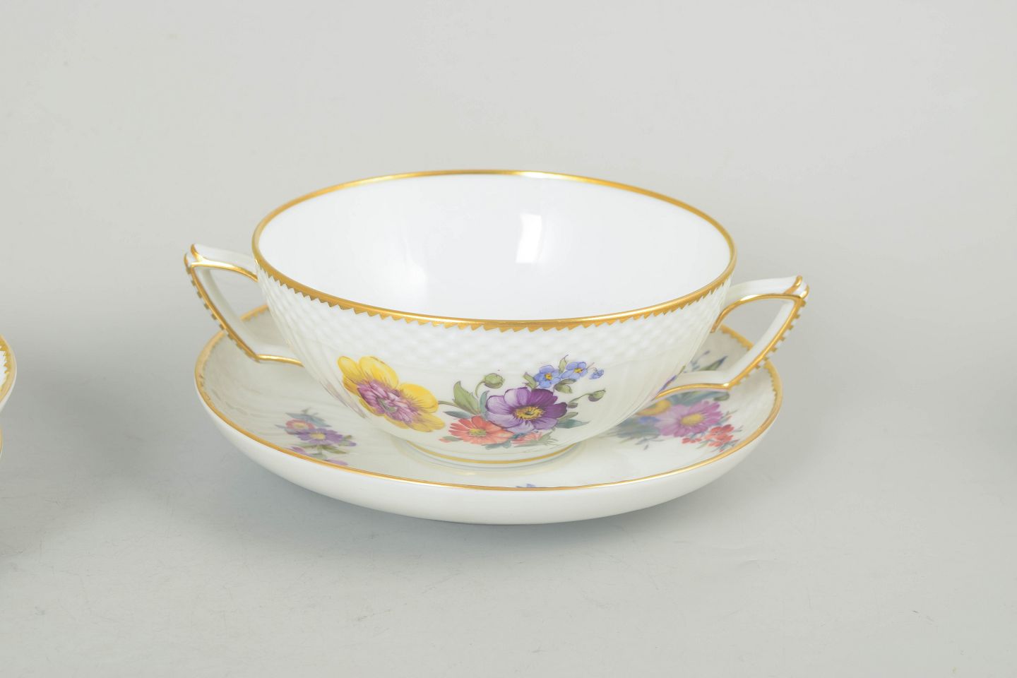 Set of four bouillon cups with matching saucers in porcelain decorated with hand-painted floral motifs in the Saxon flower pattern and finished with a gilded rim. Model 4/1872. First factory quality.