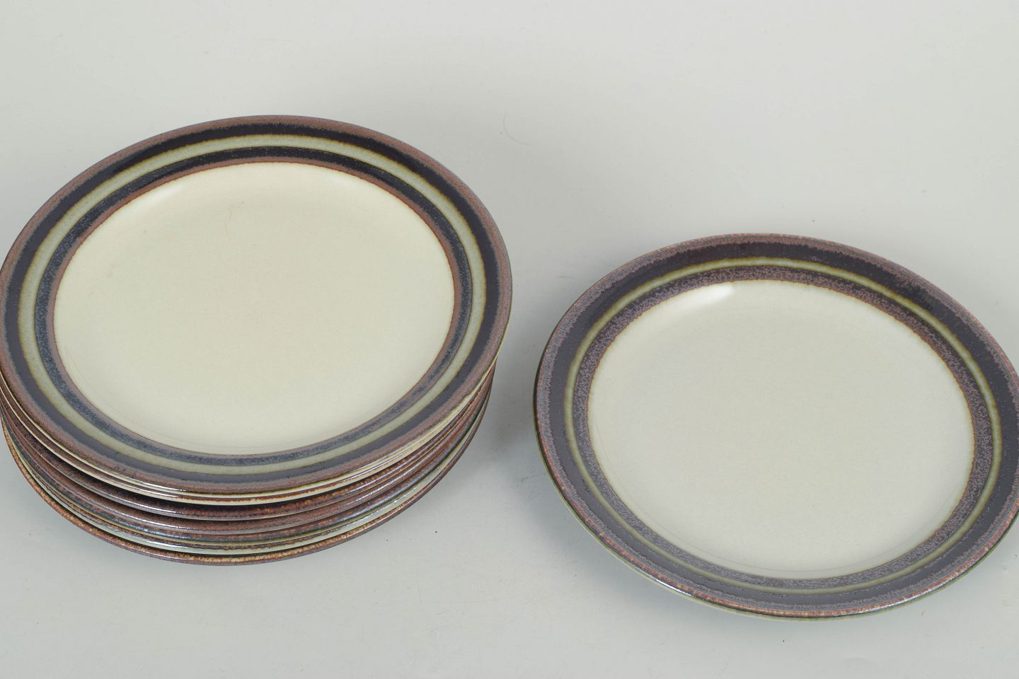 Classic stoneware plates with characteristic striped rim decoration in brown, green and dark tones, Karelia model by Arabia.