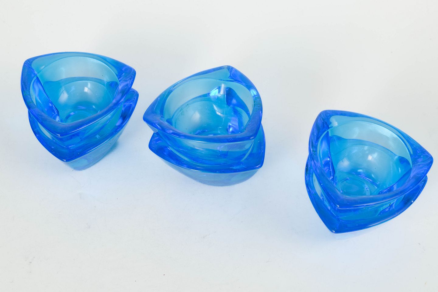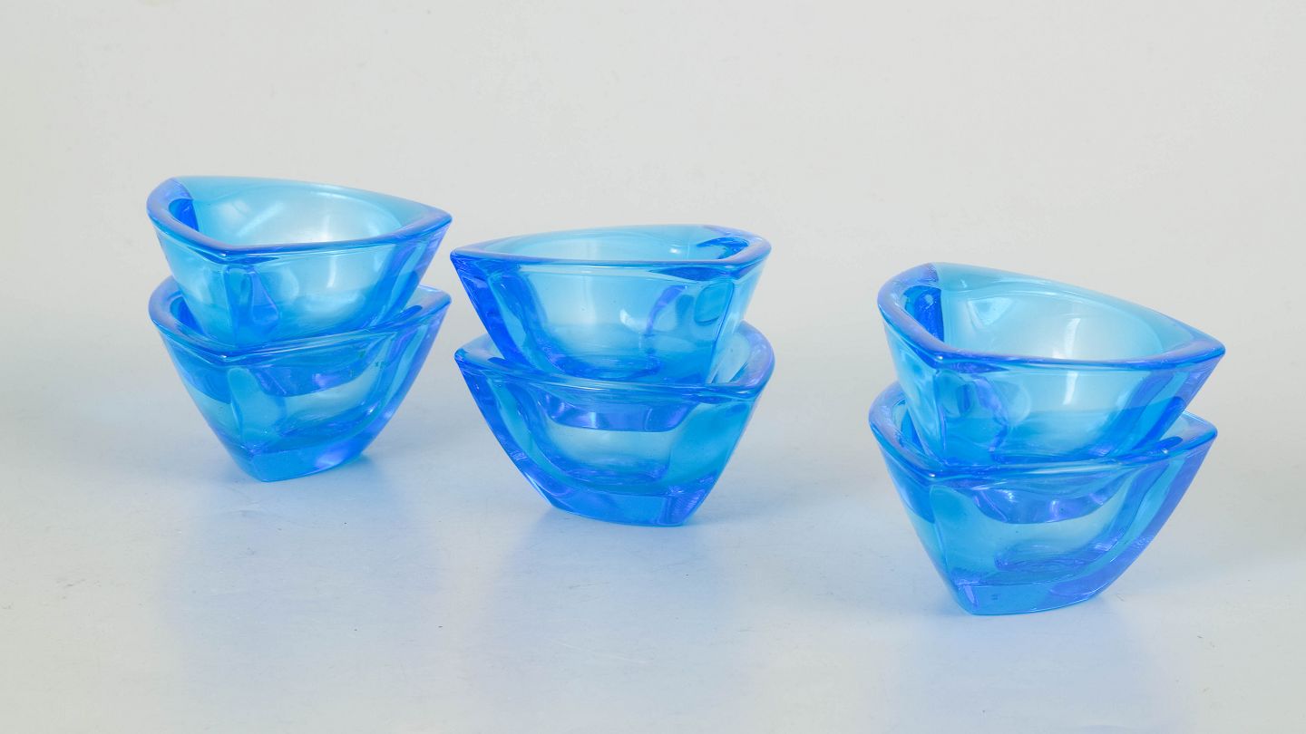 Organically shaped bowls in blue glass, “Bull’s eye” model, with original stickers and box.