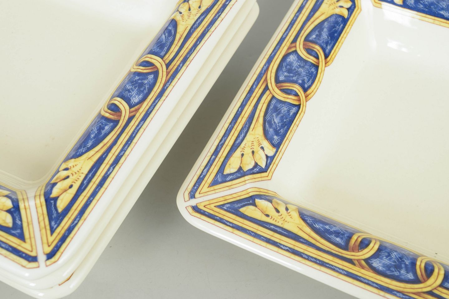 Decorative ceramic set consisting of four dinner plates with a wide border in blue, yellow and gilt tones with ornamental motifs.