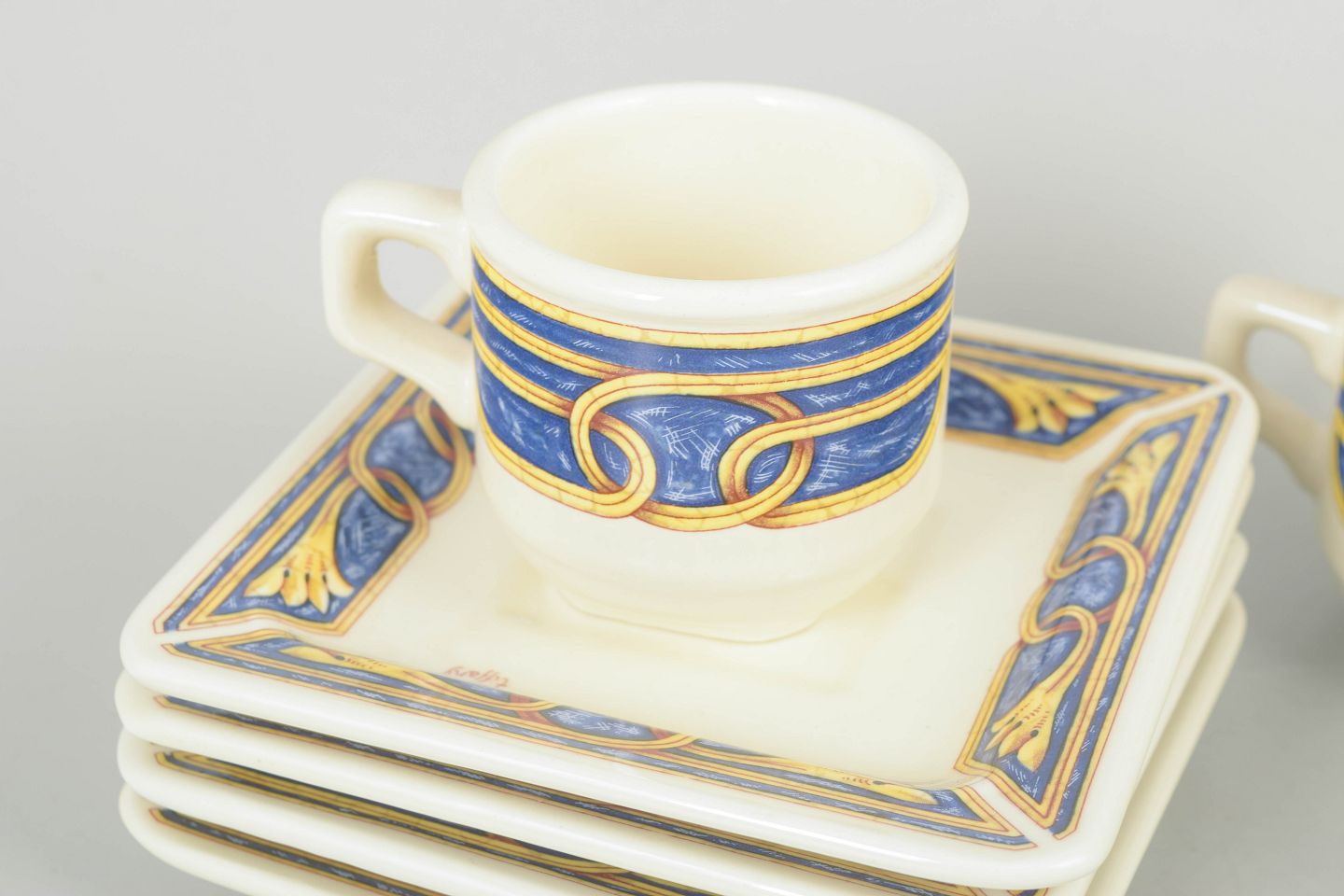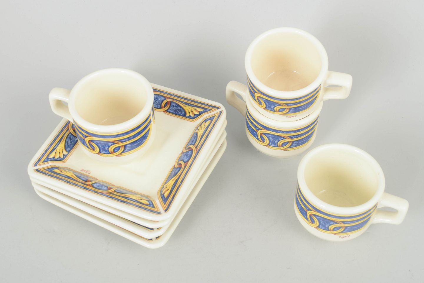 Decorative ceramic set consisting of four espresso cups with matching saucers, decorated in blue, yellow and gilt tones with ornamental motifs.
