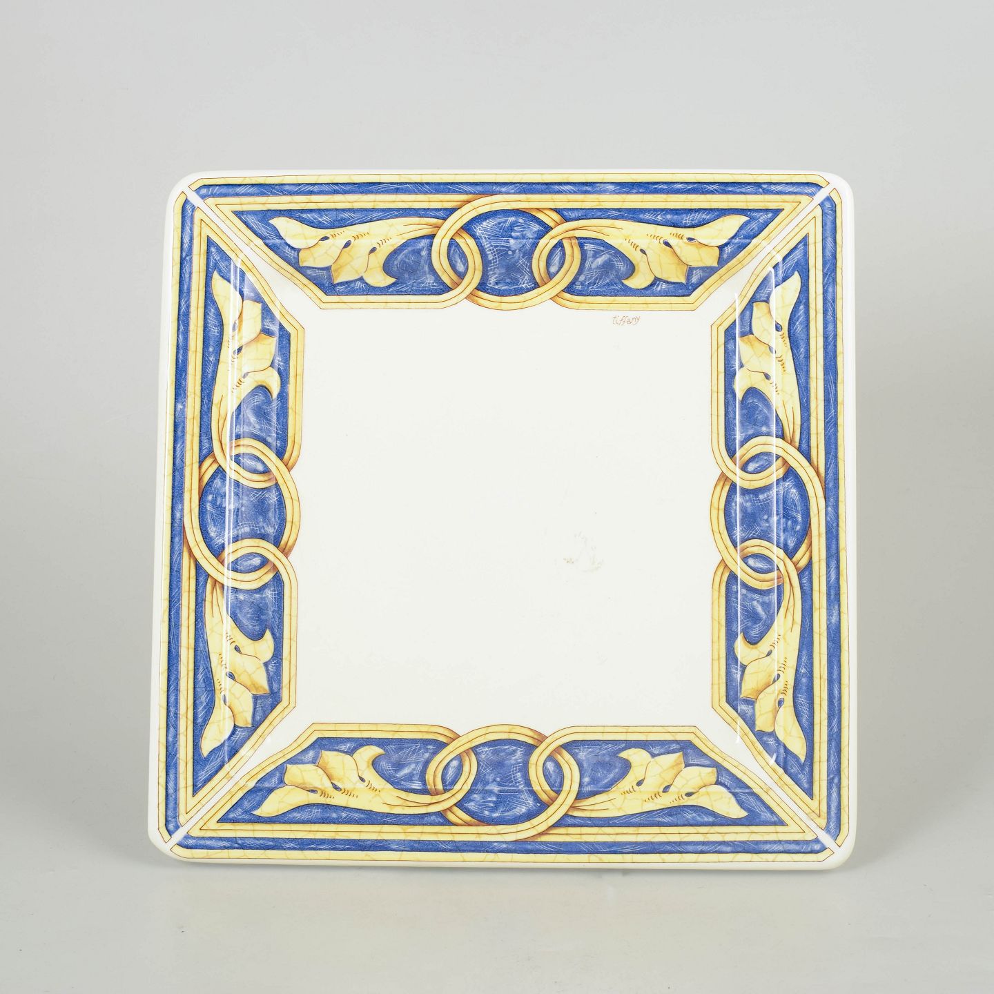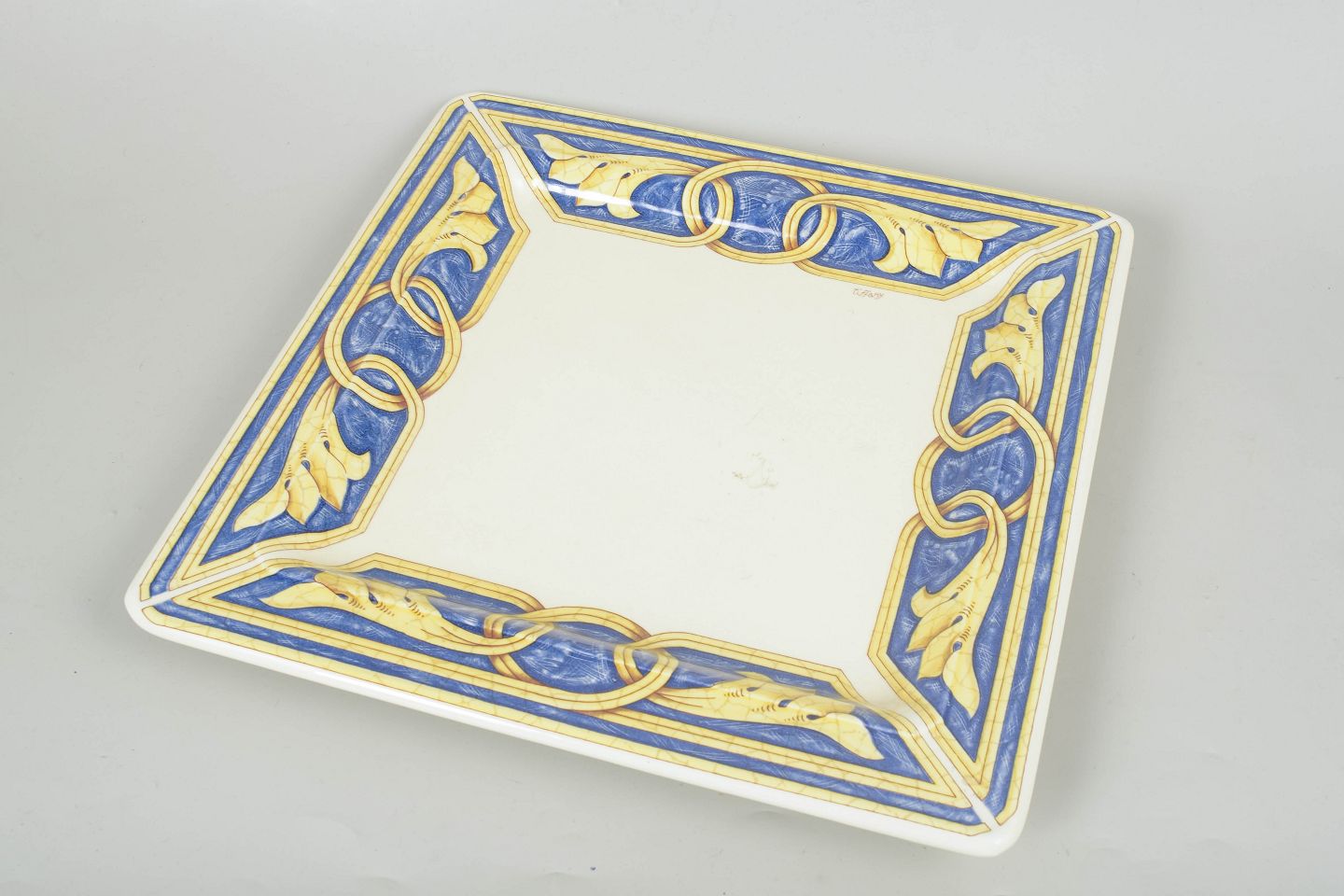 Decorative square ceramic dish with a central white field and a wide border in blue, yellow and gilt tones with ornamental motifs.