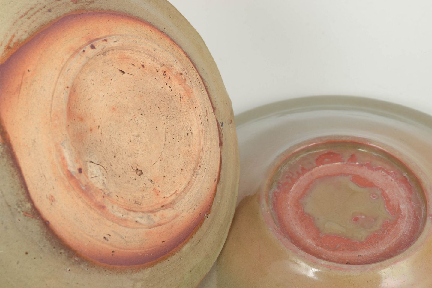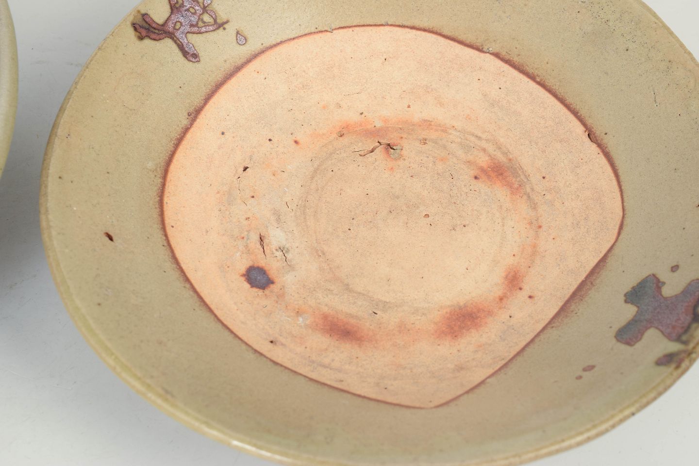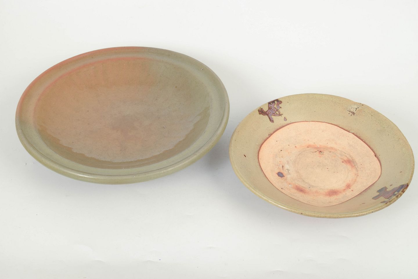 Two ceramic dishes, including one larger example with celadon glaze from Longquan, featuring a soft green glaze and a classic understated form of the period.