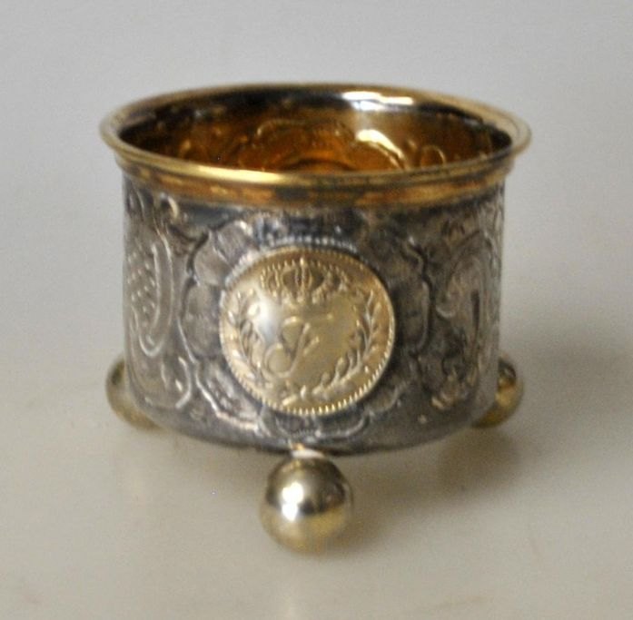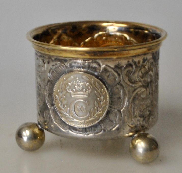 Swedish silver goblet in baroque form, 1951. On three ball feet. The side is decorated with rocailles and two Swedish one-eared coins from 1694 and 1722 respectively. Inside is gilded. Stamped. H.: 4 cm. Dia.: 4.5 cm.