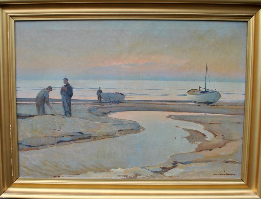 Valentinussen, Chr. (1903 - 1985) Denmark: Fishermen by the North Sea. Oil on canvas. Signed. H: 69 cm. W: 100 cm.