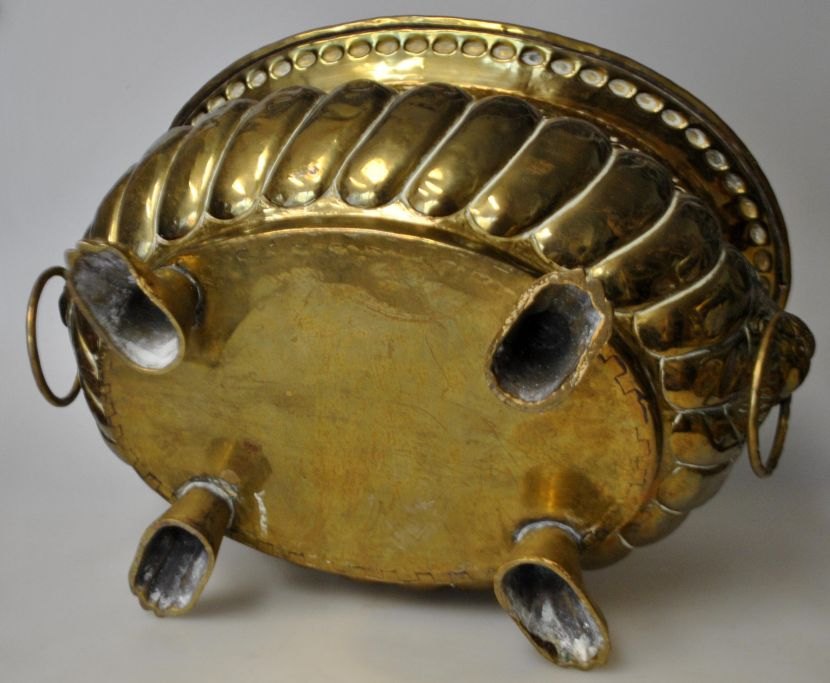 Danish flower pot cover in brass, 19th century. With lion feet. Decorated with two lion heads with rings in the mouth. H.: 17 cm. Dia.: 31 cm.