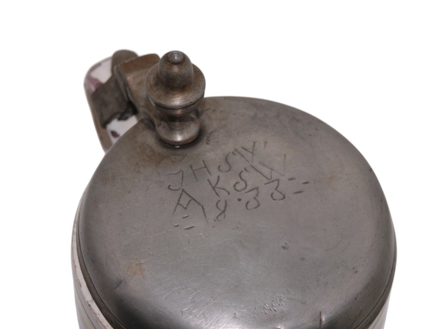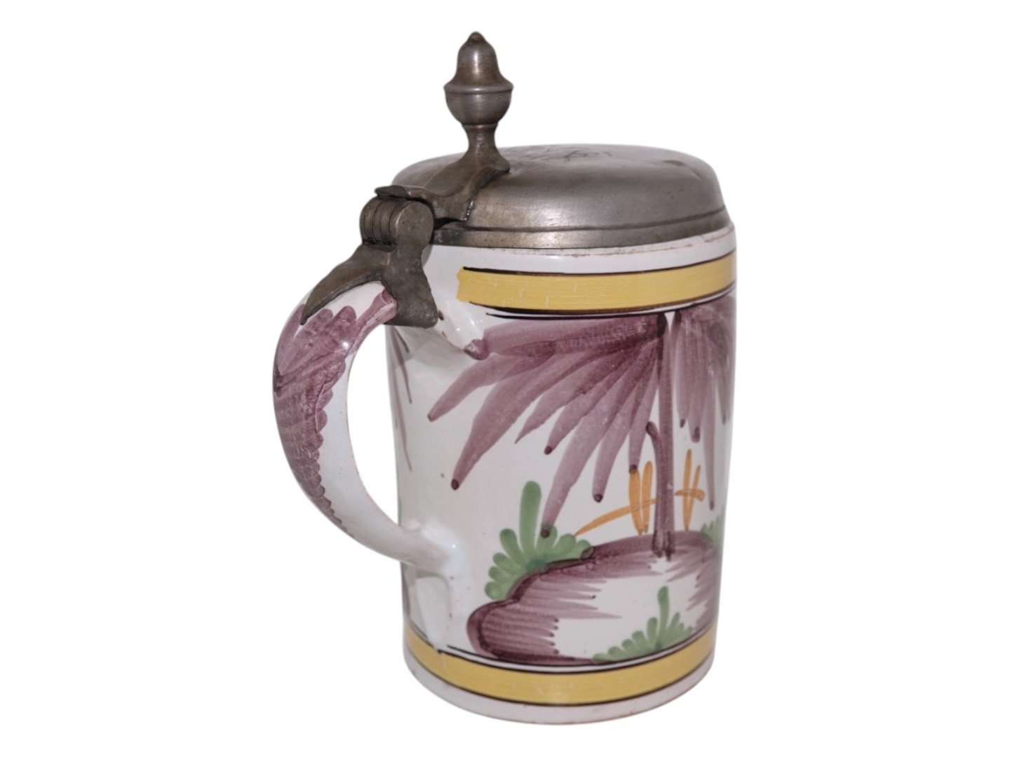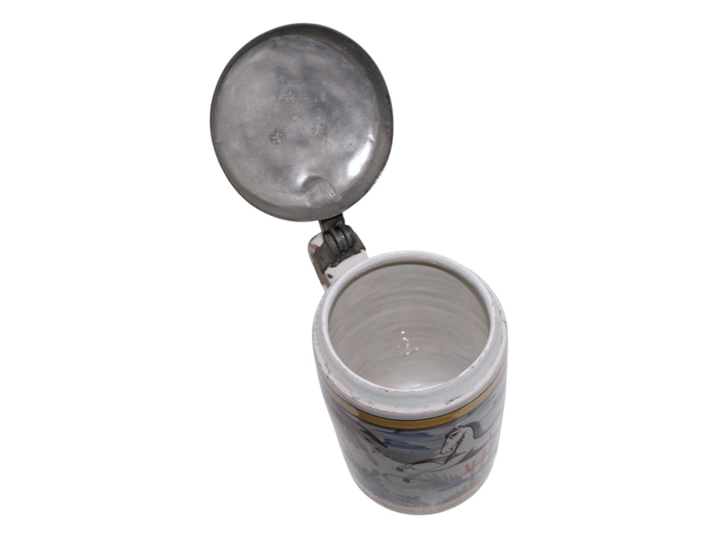 Large faience mug decorated with a horse. There is a tin lid that has a later inscription from 1833. The mug was made between 1790 and 1810.