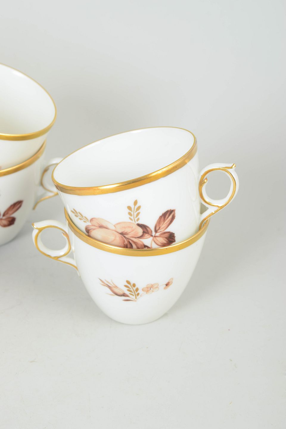 Elegant white porcelain service decorated with brown floral motif and gilt rim. Model 688/9069. First quality.