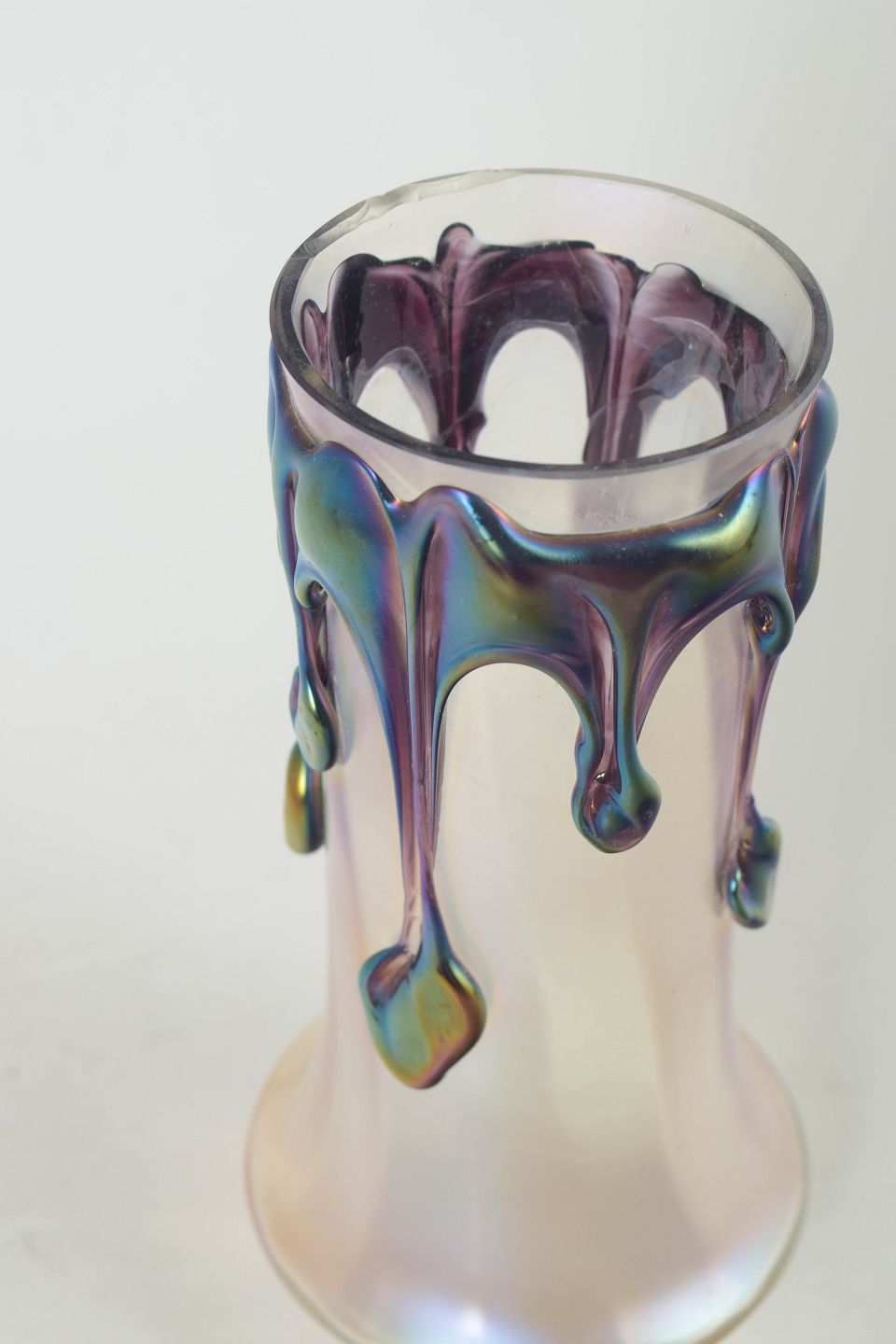 Johann Lötz Witwe was an Austrian glass manufacturer founded in 1836 in Klostermühle, Bohemia. The company gained international recognition around 1900 for its iridescent art glass with organic forms and advanced glassmaking techniques. During the interwar period, production evolved towards more sculptural and decorative expressions, often featuring applied glass elements as seen on this vase.