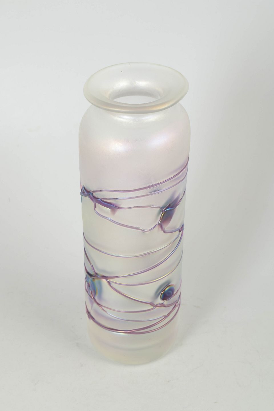 Cylindrical vase in mouth-blown glass with a frosted, iridescent surface and applied trailing decoration in violet and blue tones with small glass applications.