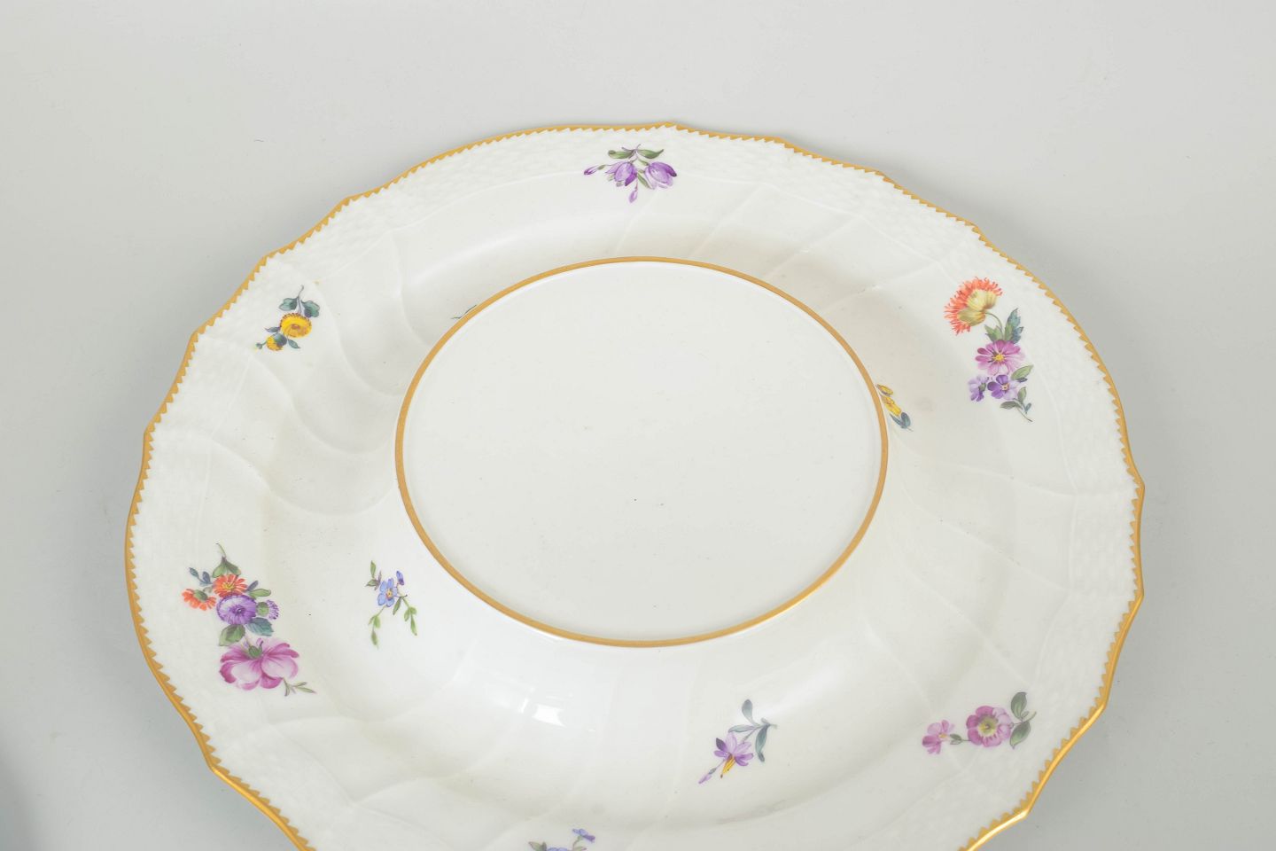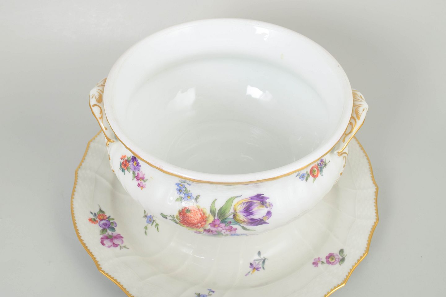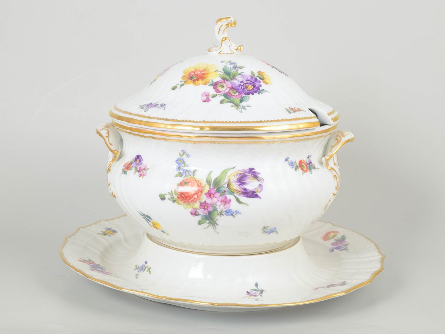 Very large porcelain tureen with matching underplate in the Saxon flower pattern with polychrome floral decoration and gilded edges. The tureen with lid and side handles, the underplate with scalloped rim. Model 4/1660 tureen and model 4/1664 plate, first quality.