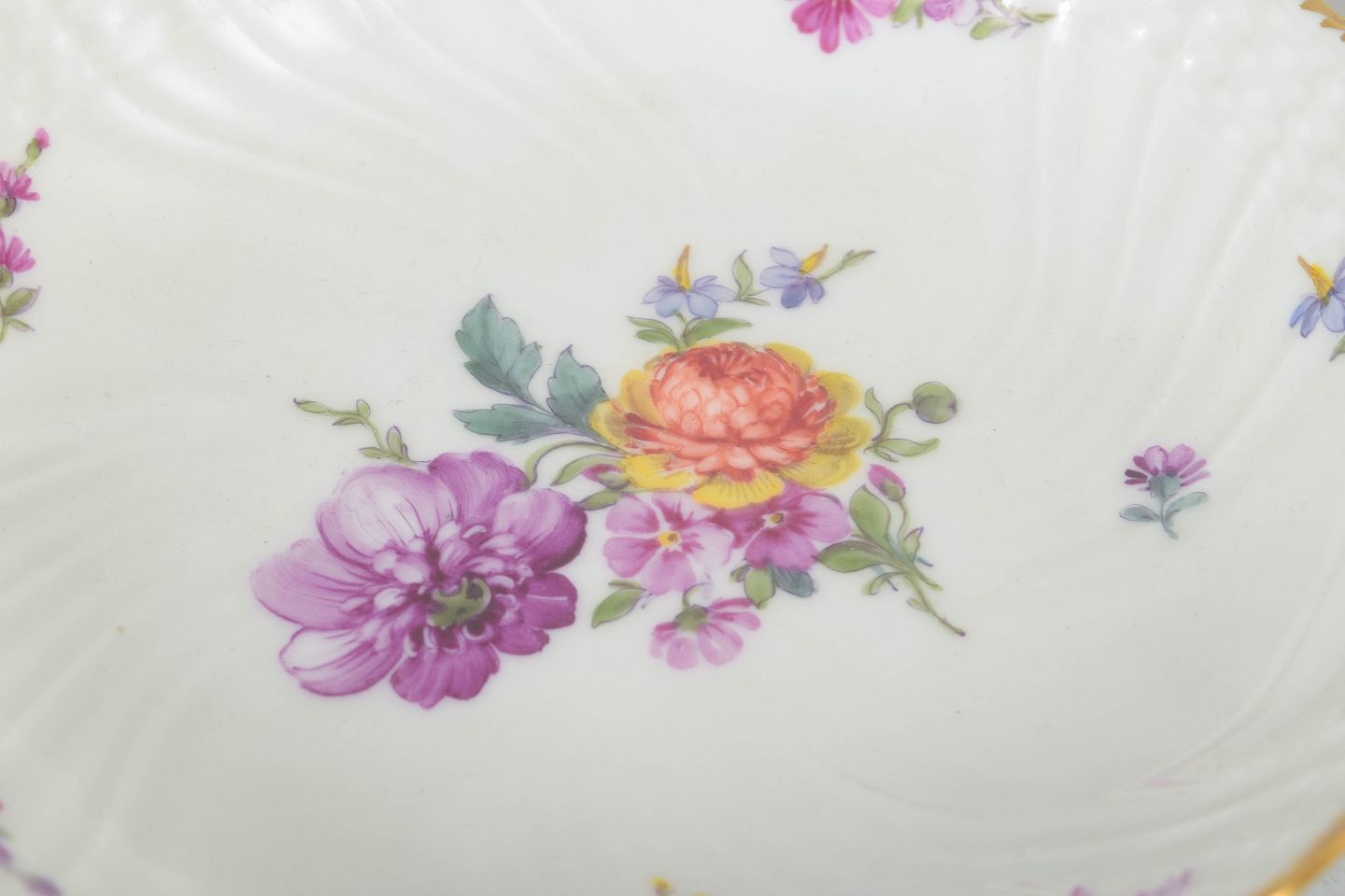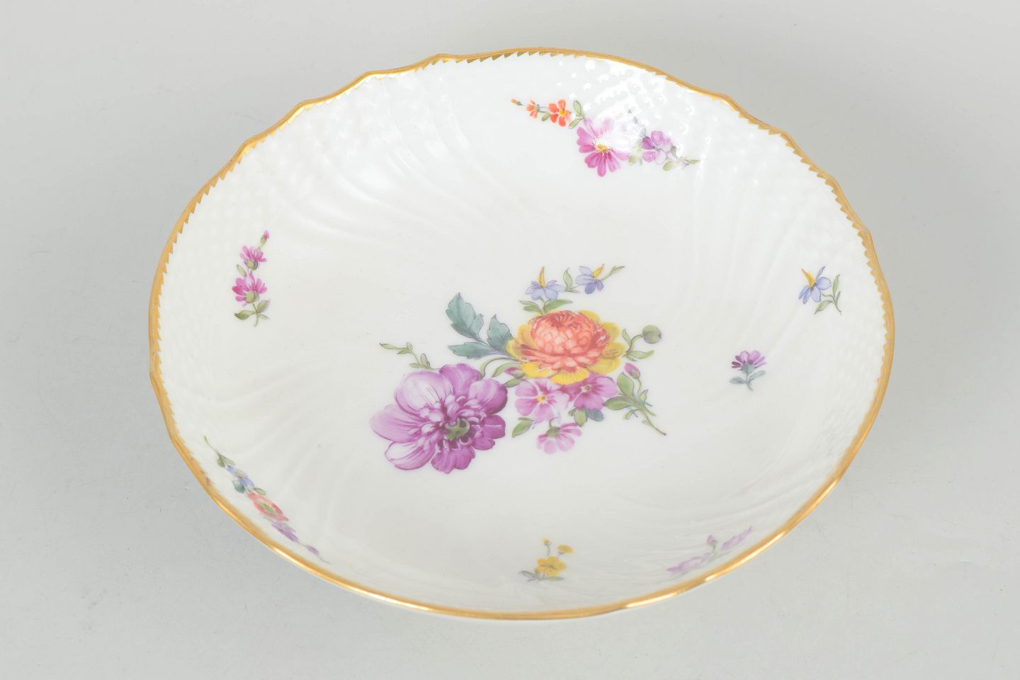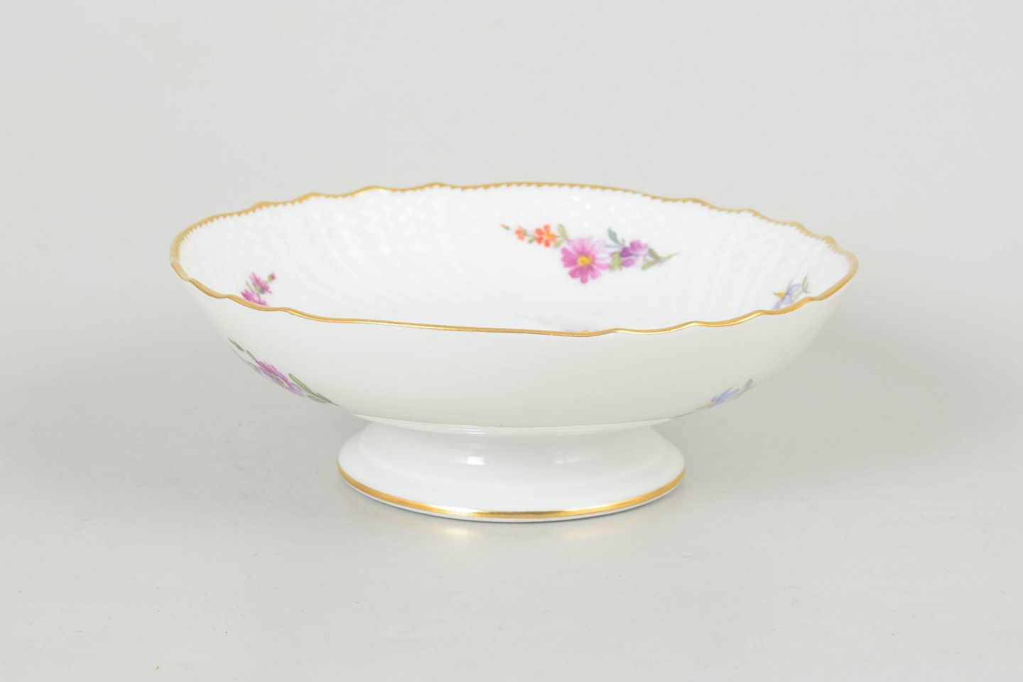 Porcelain compote with polychrome floral decoration in the Saxon flower pattern and scalloped rim with gilded edge. Raised on a foot with a classic profile. Model 4/1532, first quality.