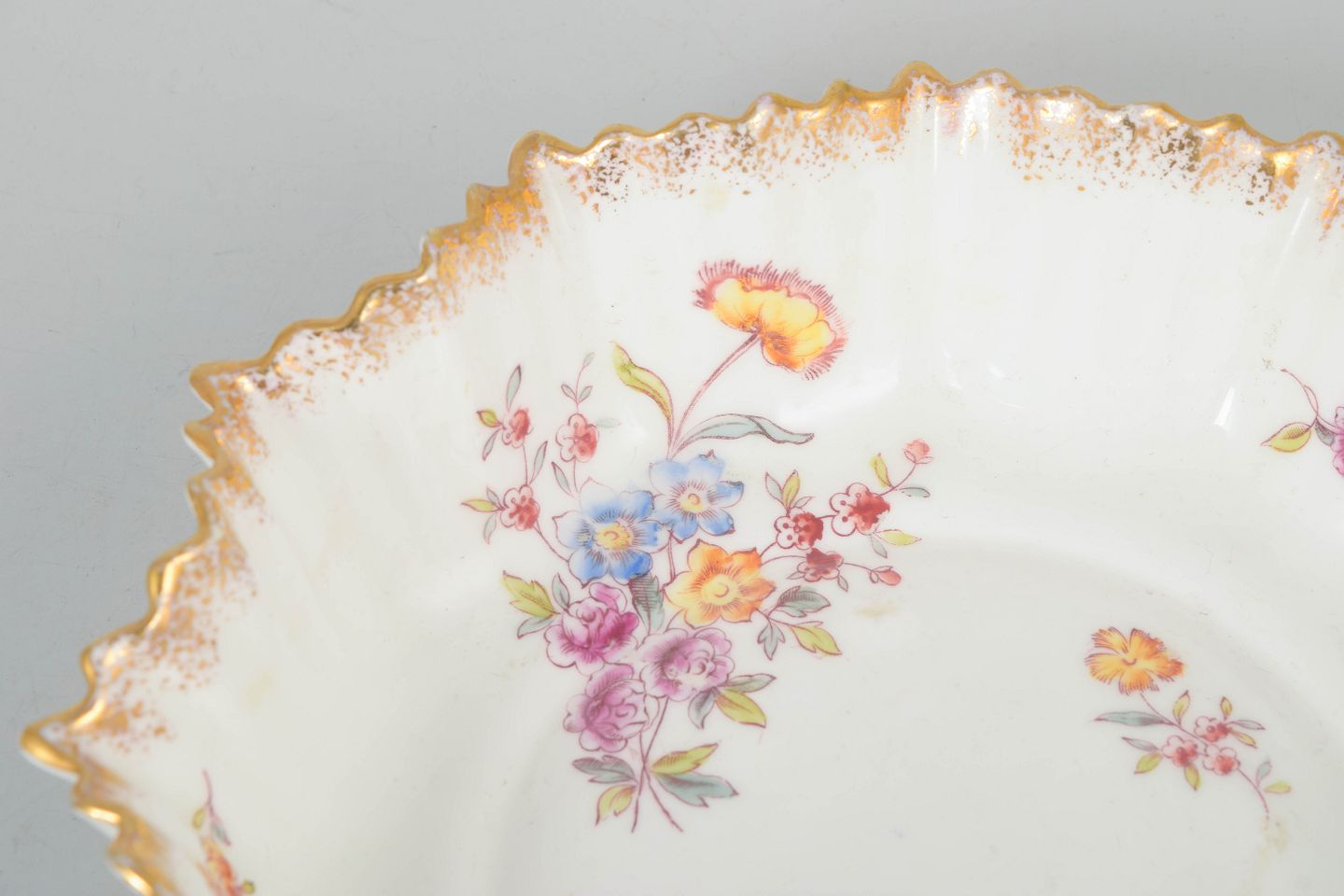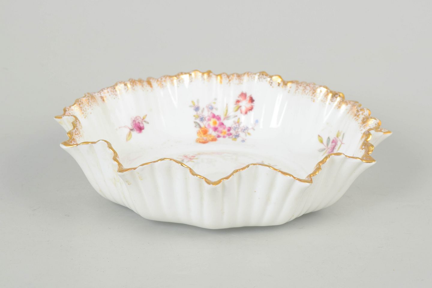 Round porcelain bowl with a scalloped and gilt rim, decorated with polychrome floral bouquets in delicate pastel tones.