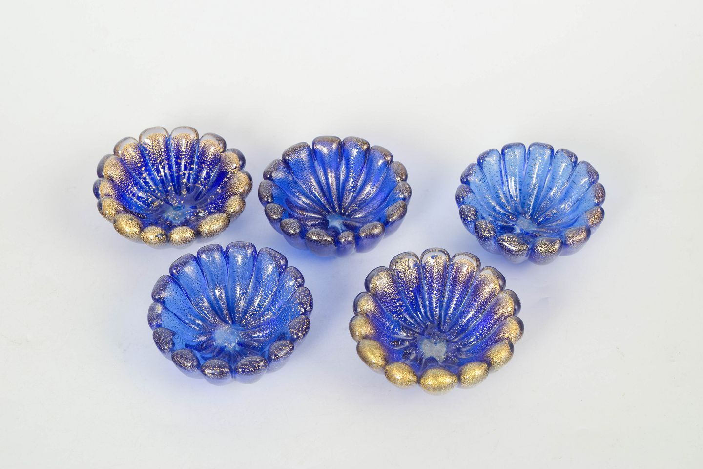 Five small moulded glass bowls with fluted, scalloped form and decorative surface in blue and golden tones.