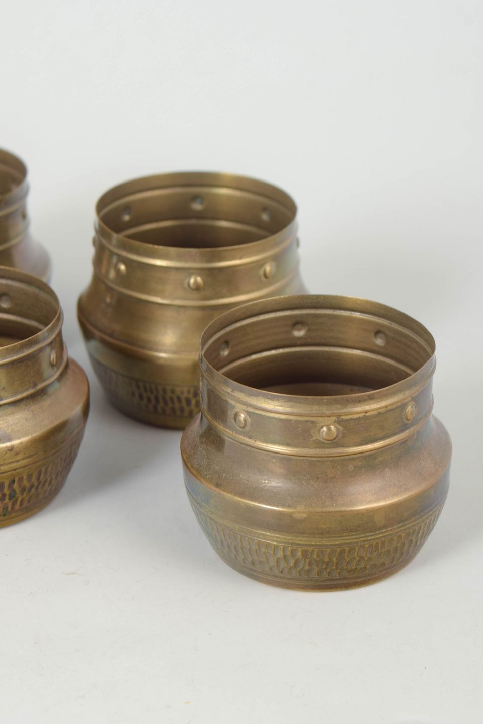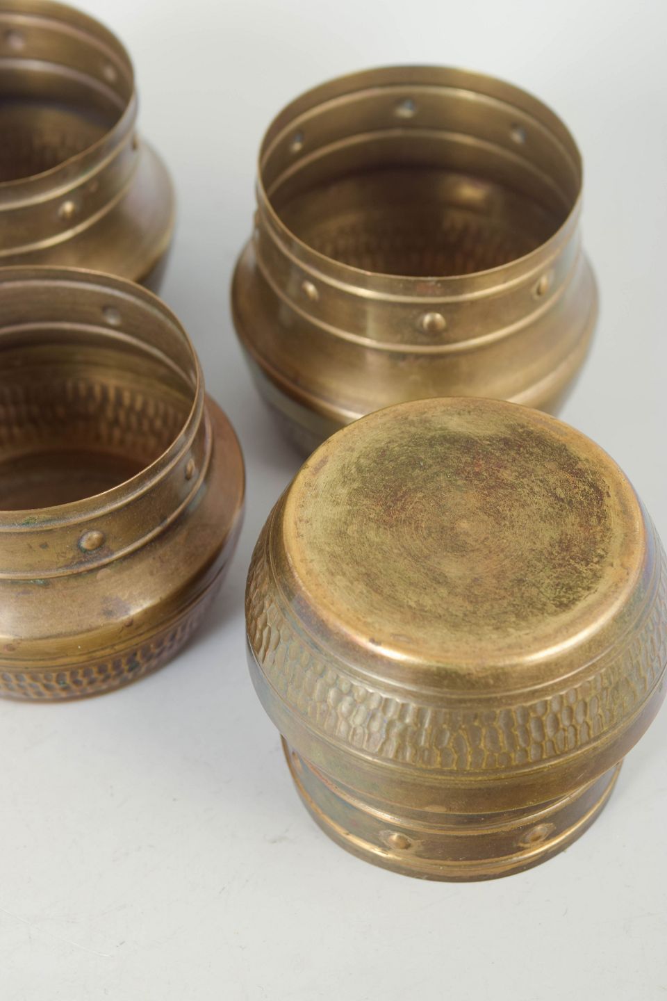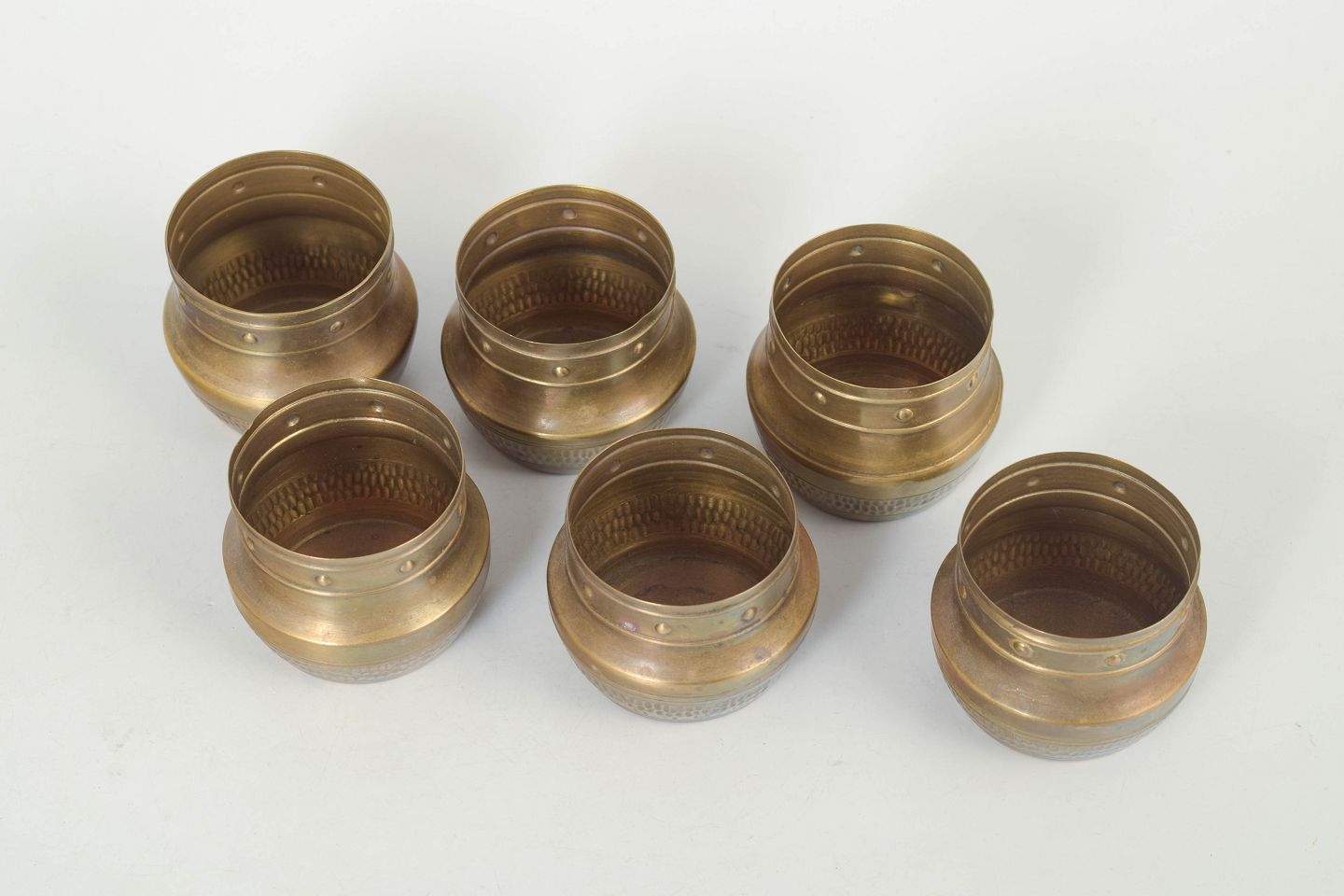 A set of six small brass cups with a simple cylindrical form, produced in the Scandinavian design tradition of the mid-20th century.