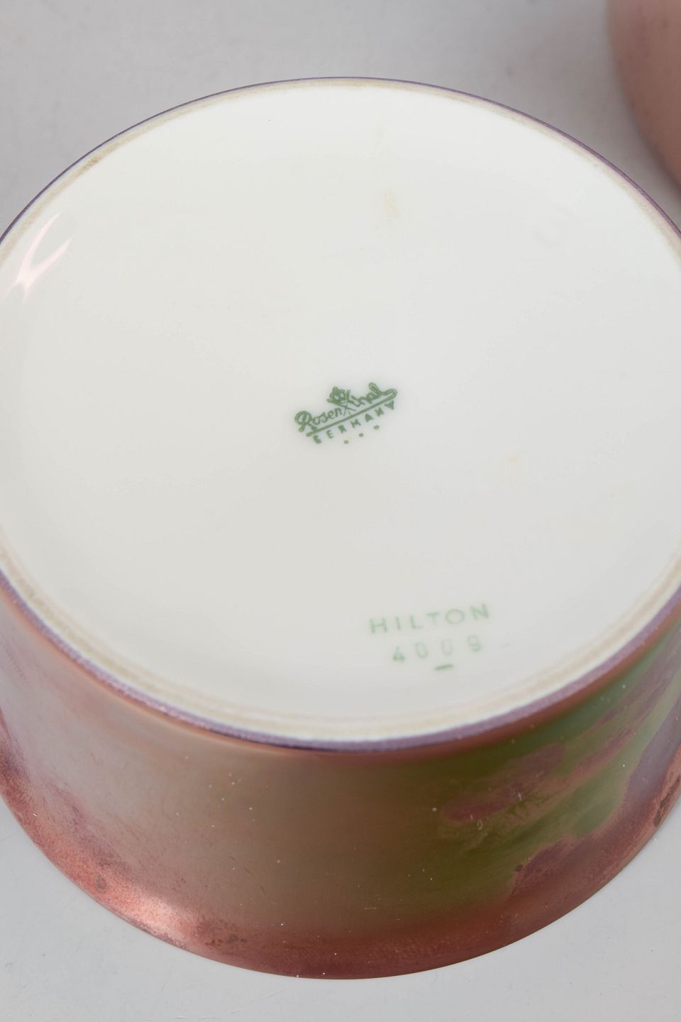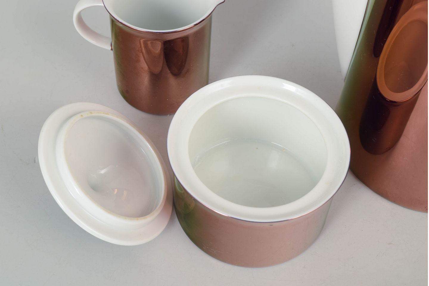 Coffee set from the Hilton series consisting of a coffee pot, creamer and sugar bowl in porcelain, executed in a characteristic form with pink glaze and metal-mounted lids.