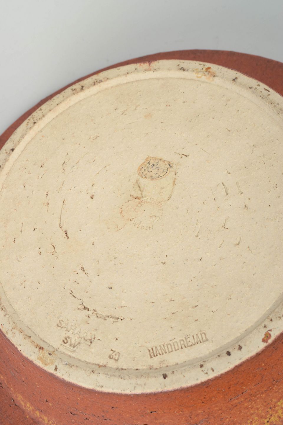 Large stoneware bowl with characteristic “Sahara” glaze in warm tones of orange, ochre and brown with a subtly textured surface and central factory mark.