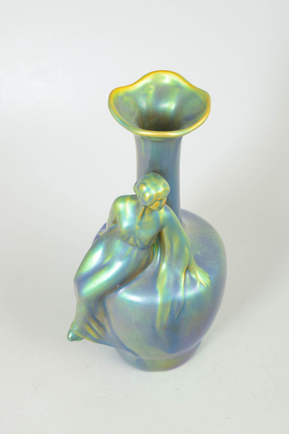 Art nouveau vase with integrated female figure in a flowing, organic form. Executed in the characteristic iridescent eosin glaze with shifting green, blue and golden tones.