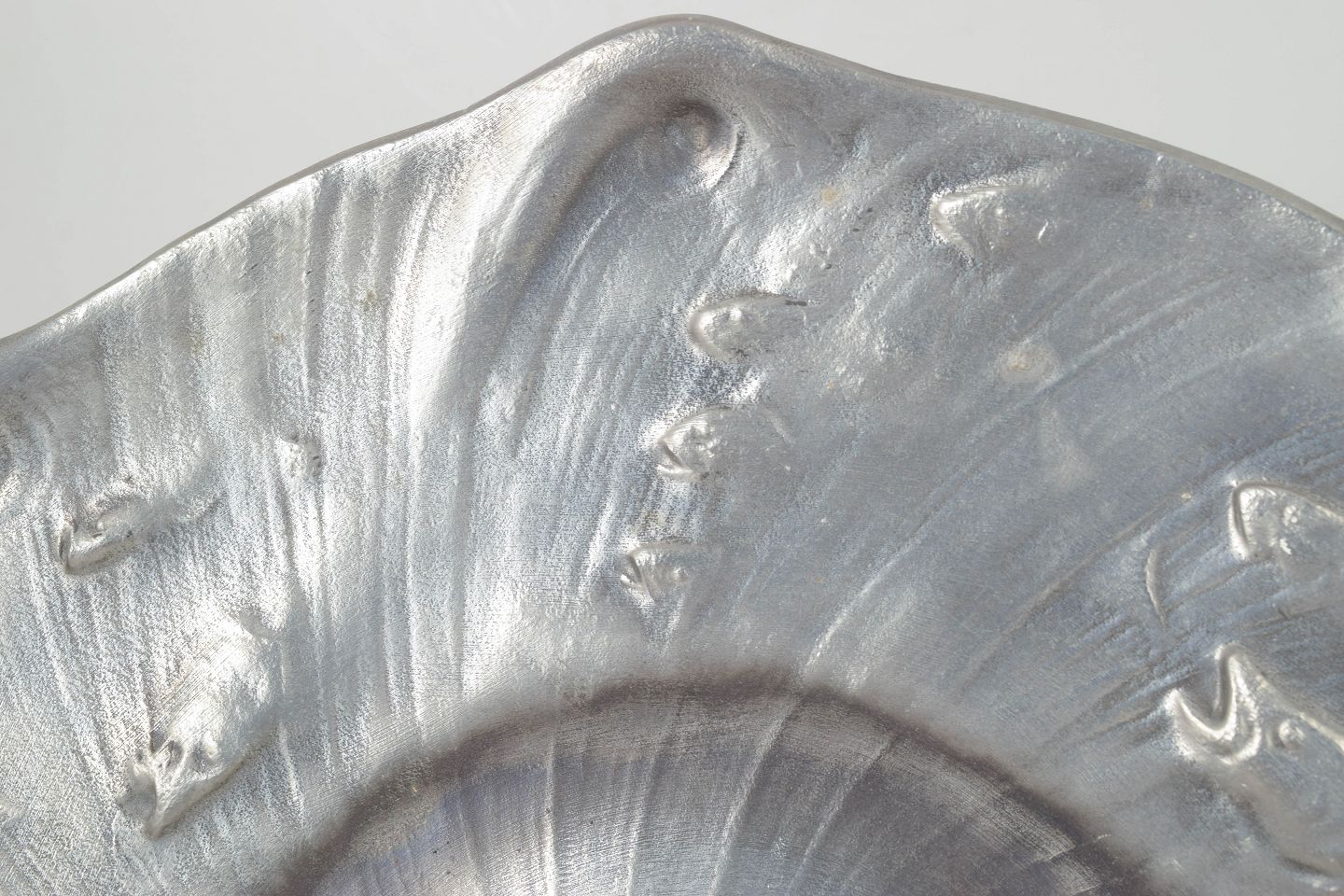 Large decorative pewter dish with an organic flowing form and fish relief decoration, produced for Schreuder & Olsson, Stockholm.