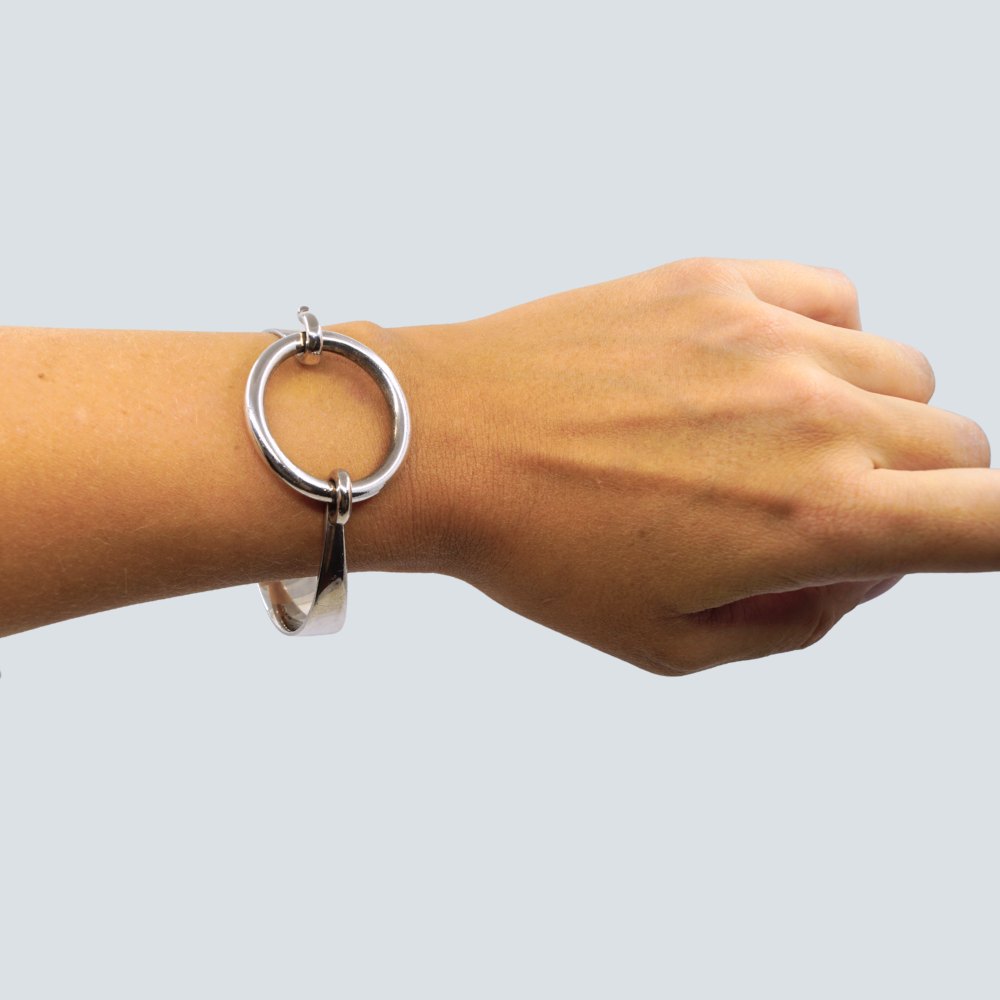 Hans Hansen; A brangle made of sterling silver. Front shaped like a cirkel, and can be opened.