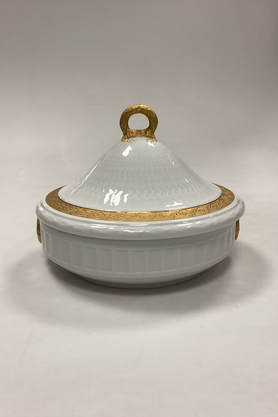 Royal Copenhagen Gold Fan lidded bowl No 11503. Measures 22cm x 16,5cm and is in good condition.