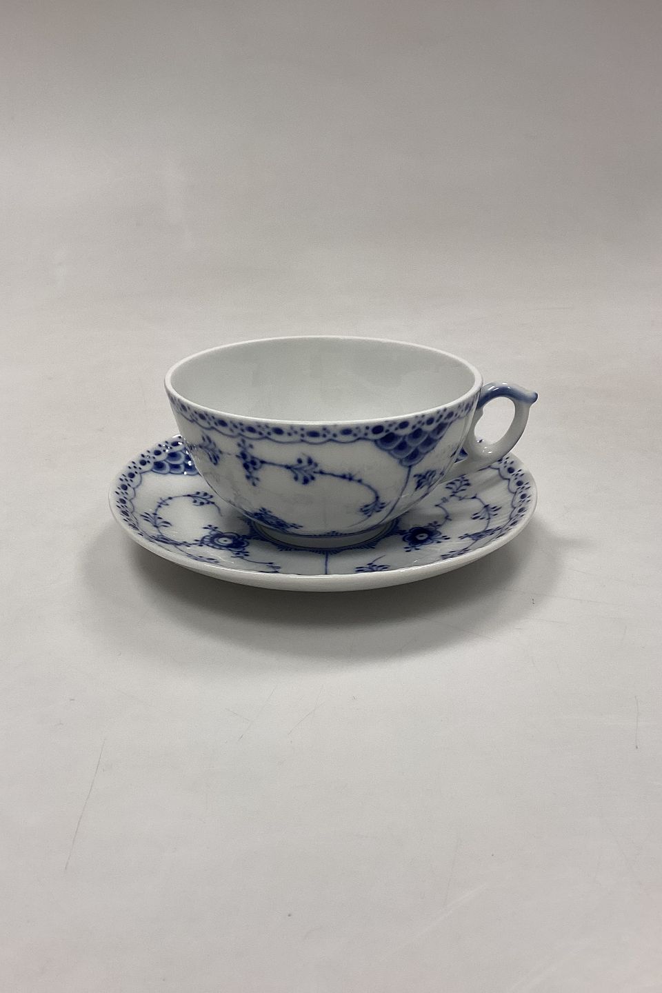 Royal Copenhagen Blue Flute Half Lace Large Tea Cup No. 656. Measurements: Cup 5.5 cm x 10.5 cm / 2.16 in. x 4.13 in. Saucer 15 cm / 5.90 in.