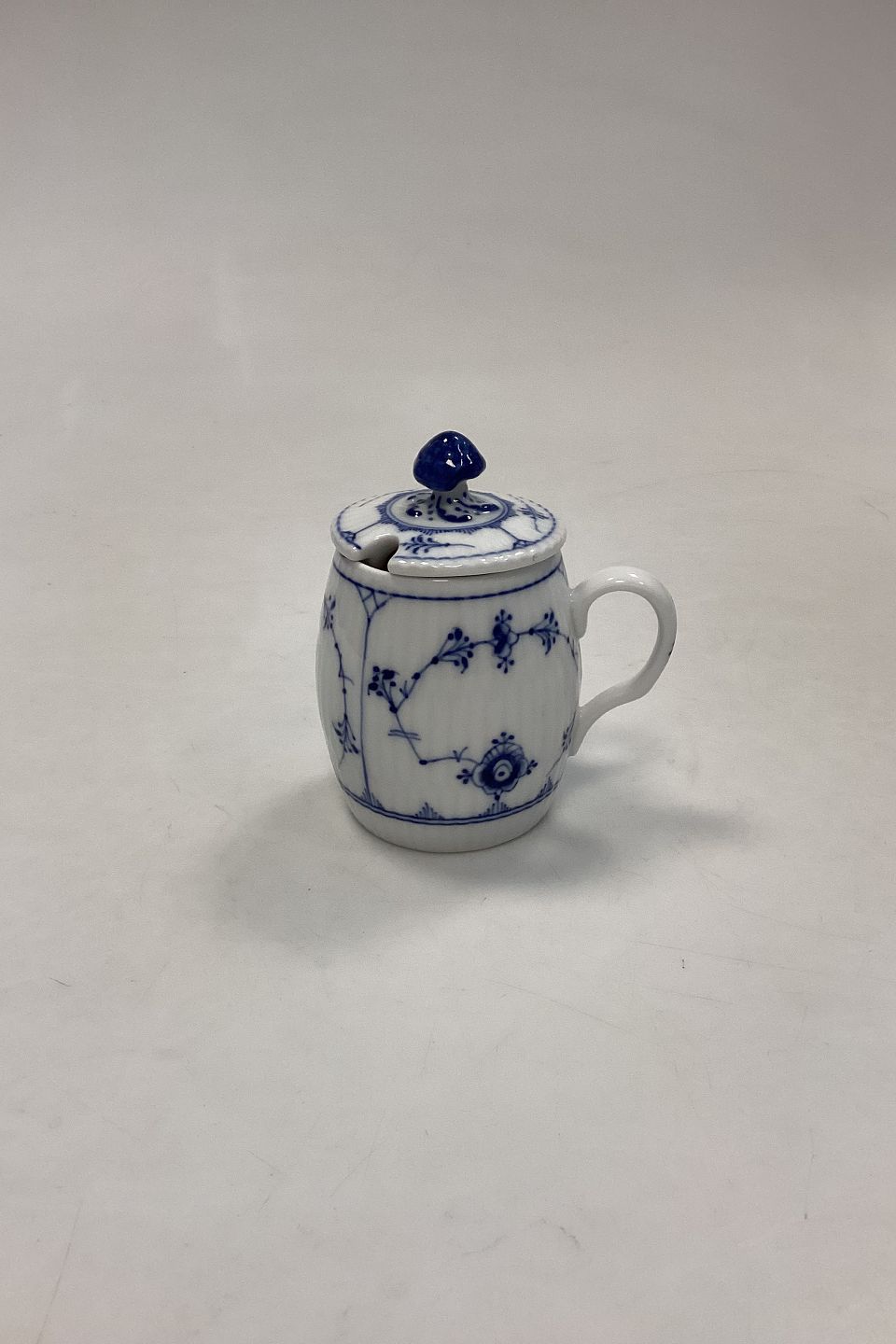 Royal Copenhagen Blue Fluted Mustard Jar with Lid No. 137. Small crack in the cup at the top of the rim.