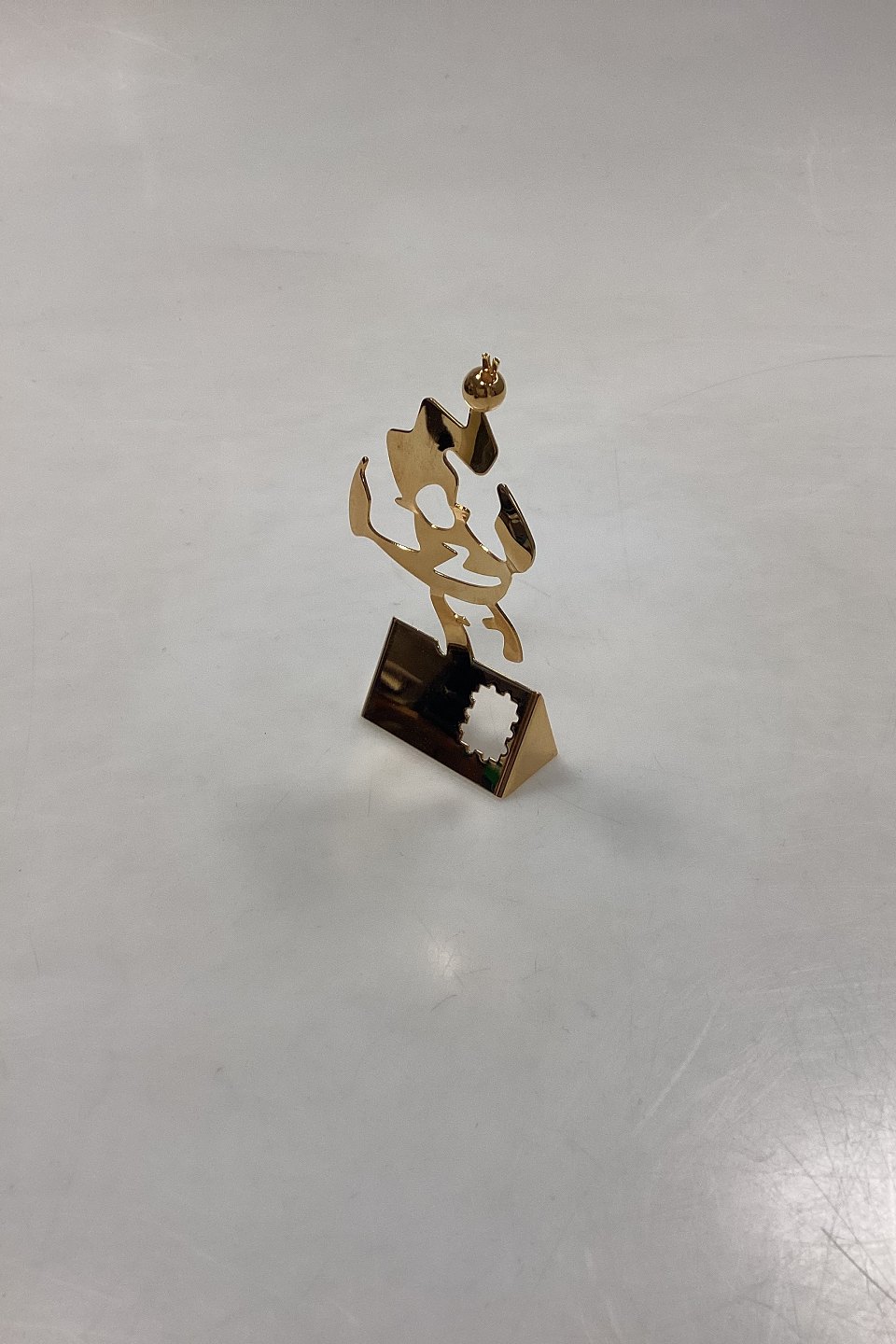 Georg Jensen Christmas Classics Christmas Ornament - Elf on Christmas Card. Designed by Leo Griffin. Steel plated with 24-carat gold.