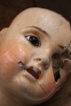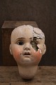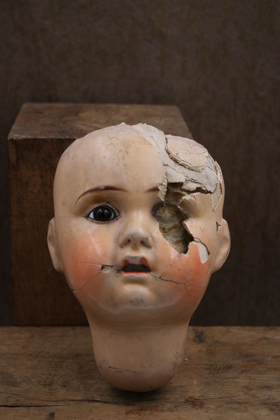 The doll's head is broken on one side, with decorative decay in all its appearance like a small art installation. H: 17cm. Dia.: 12cm.