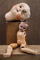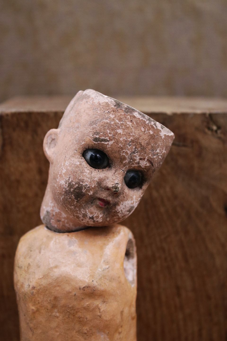 Old 19th century doll, head with glass eyes, body and legs in painted papier-mâché with a nice old patina. H: 31cm.