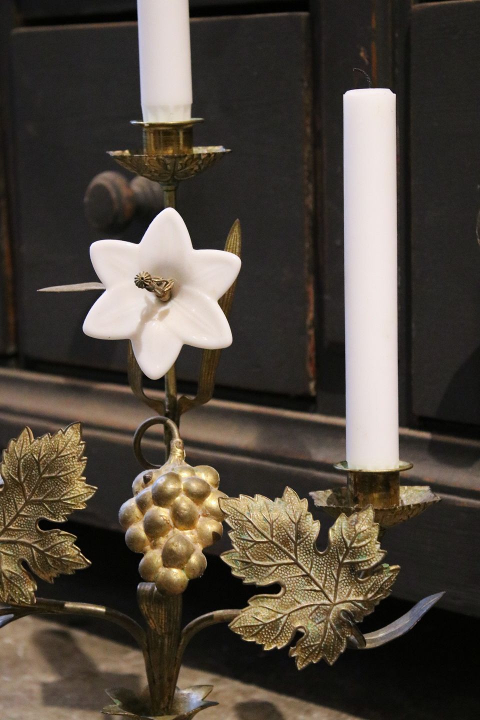 Decorative French 19th century church candlestick with space for 3 candles and decorated with 1 white opal glass flower. H: 32cm. W: 25cm.