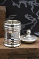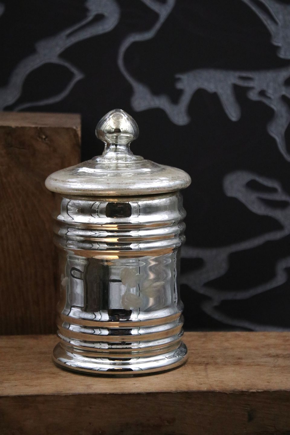 19th century lidded jar in mercury glass with a really nice patina. H: 17cm. Dia.: 9.5cm. Item number: Fattigmandssølv krukke nr.1