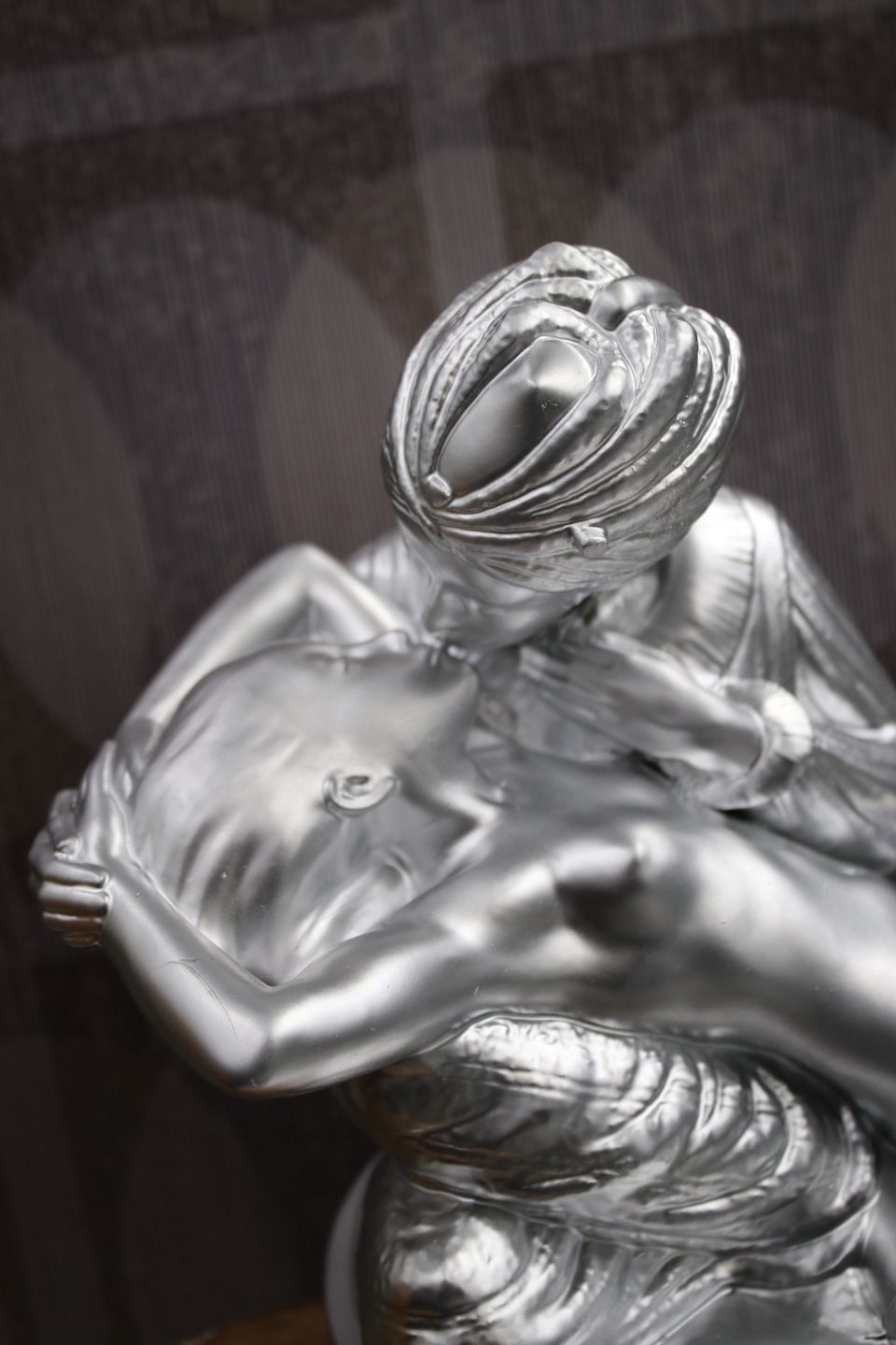 The head of the man has been glued to the neck and the figure has then been spray painted in silver chrome color.