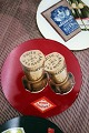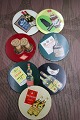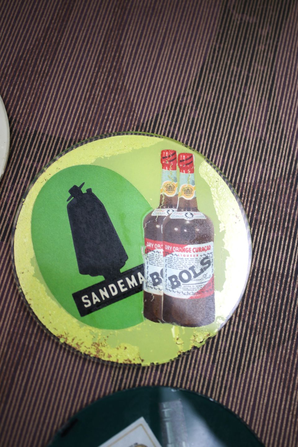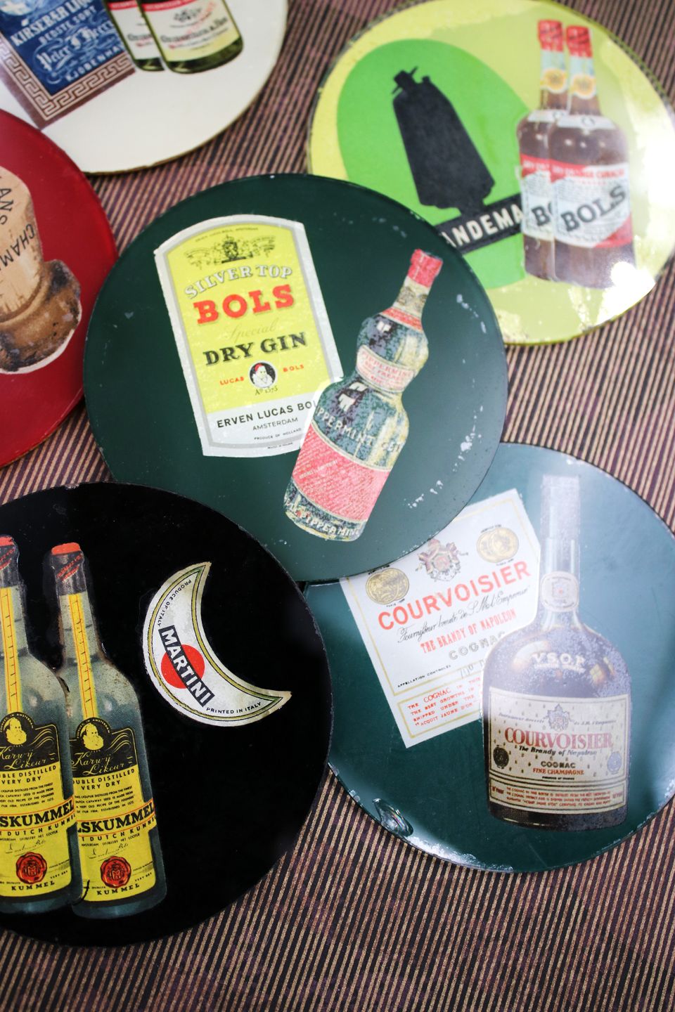 7 old drinks glass trays with motifs of various spirits and liqueur brands. Dia.: 8.8cm. Made of glass with cork bottom.