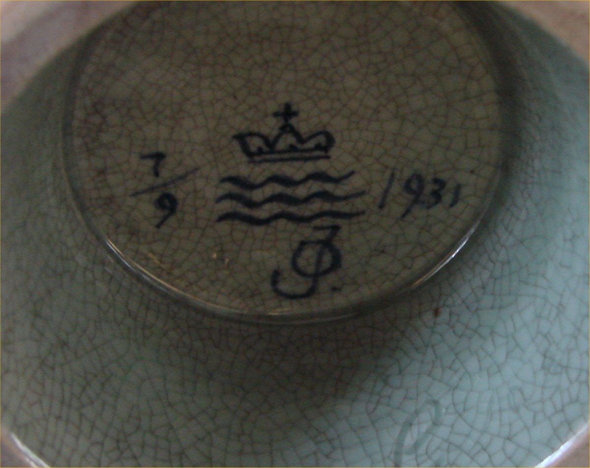 Royal Copenhagen Art Pottery 7-9 RC Bowl with flower 12 x 20 cm. Signed OJ Oluf Jensen 1931 (Crackle)