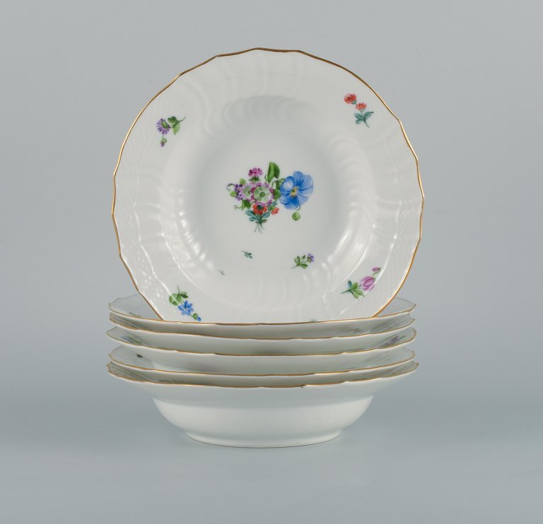 Royal Copenhagen Saxon Flower. Six deep plates in hand-painted porcelain with flowers and gold decoration.