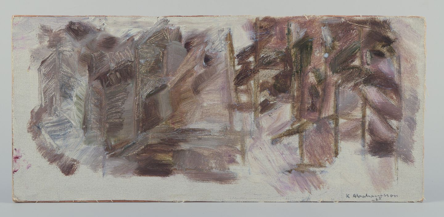 K. Abrahamsson, Swedish artist. Oil on canvas laid on board. Abstract composition. Subdued palette. Signed and dated 1965. In excellent condition. Dimensions: 41.0 cm. x 18.5 cm.