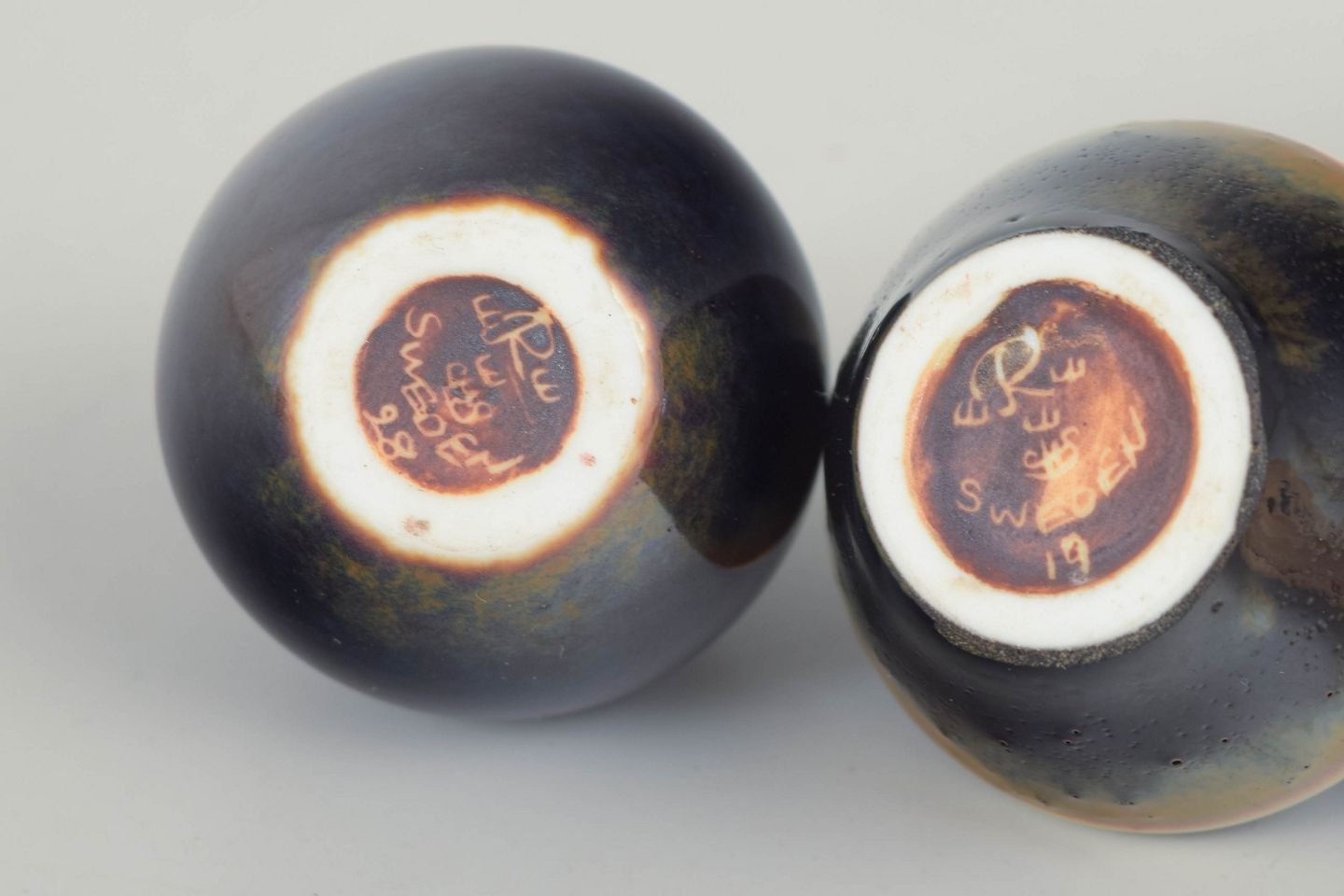 Two wheel-thrown stoneware miniature vases with richly saturated glazes in deep violet and brownish tones, both showing Stålhane’s refined sense of proportion and surface expression.