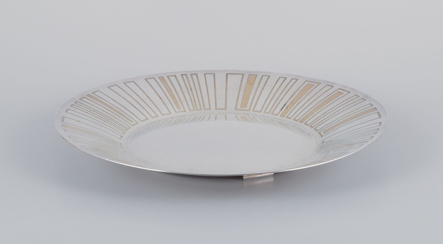 WMF, Germany. Large "Ikora" Art Deco bowl with three feet, silver-plated with brass inlay.