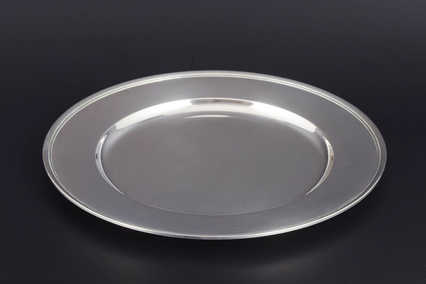 Klassisk rund dækketallerken af tretårnet sølv i enkel formgivning med let forhøjet kant, stemplet med tretårnet 830S.