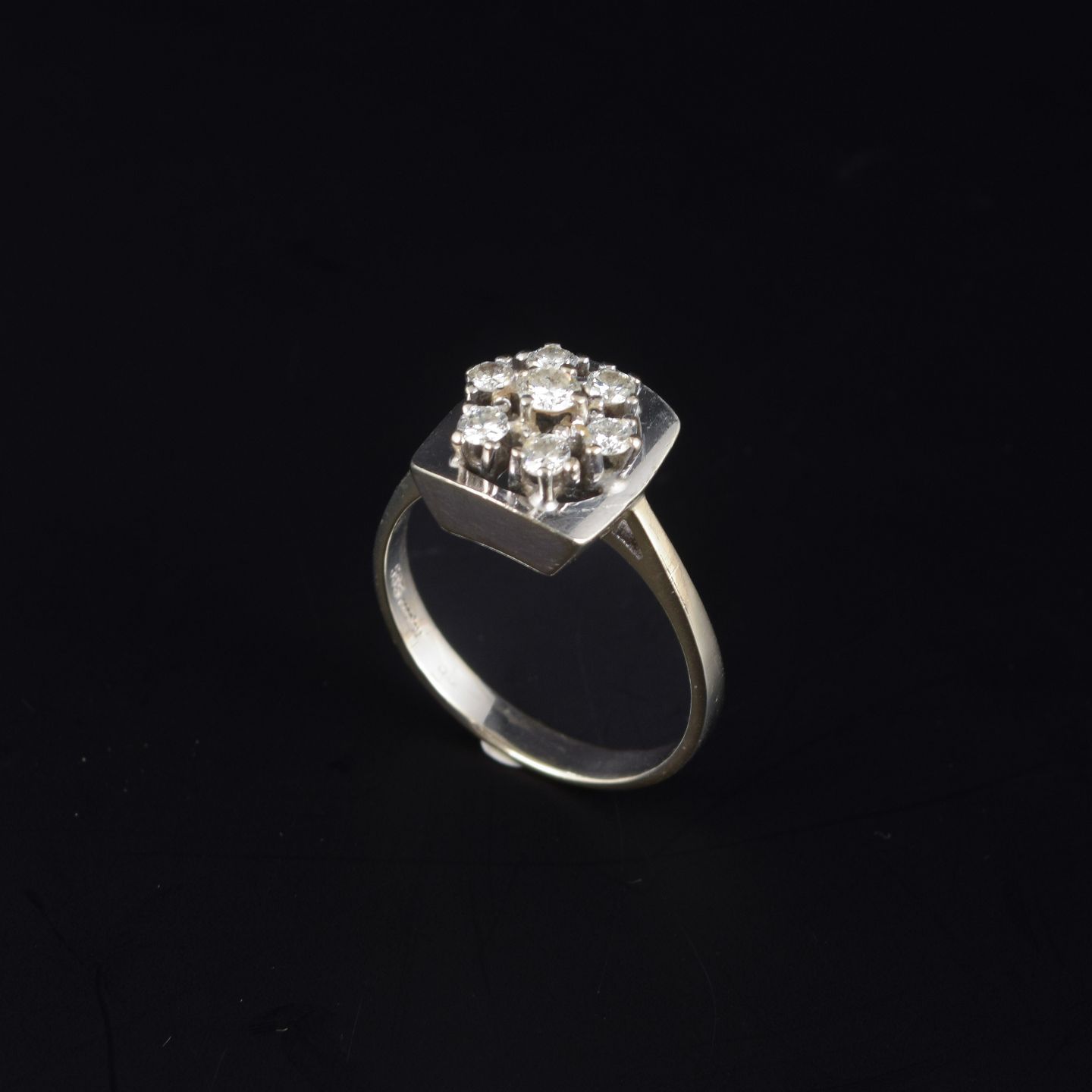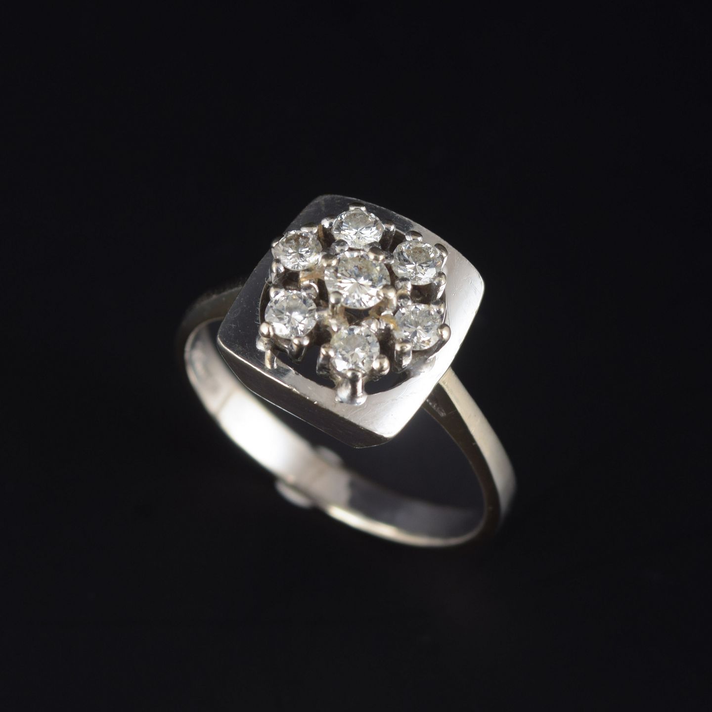 Geometrisk formet ring i 14 kt hvidguld, prydet med syv brillantslebne diamanter samlet i en blomsterformet roset.